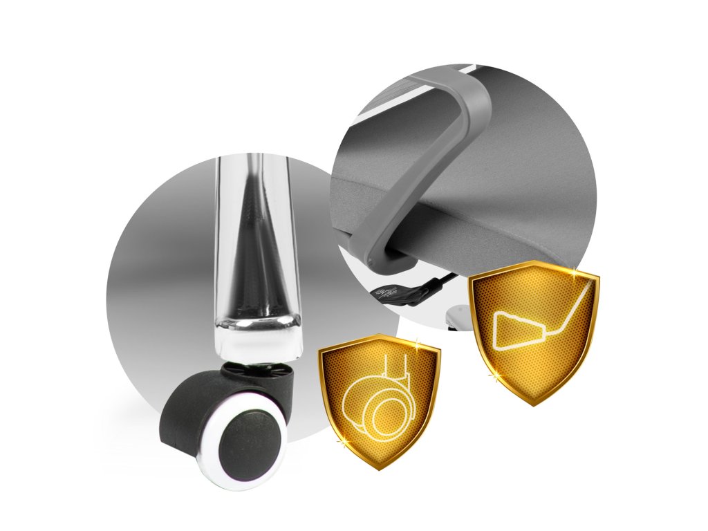 Čvrsta baza opremljena je najlonsko-gumenim kotačima , koji se tiho kreću i ne grebu pod, a elegantan rotirajući lift omogućuje zaključavanje kuta nagiba u tri položaja .
