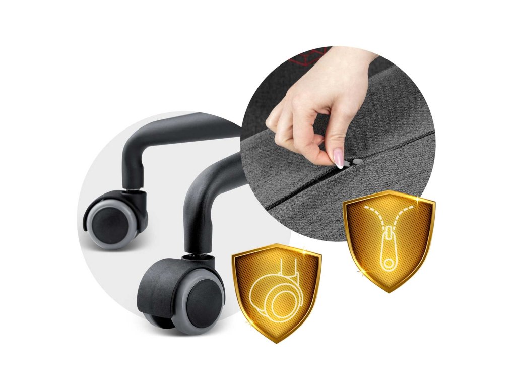 Jastuke je moguće izvaditi iz navlake zahvaljujući ušivenom patentu, a čvrsta metalna baza opremljena je najlonsko-gumenim kotačima, koji se kreću tiho i ne ogrebu pod.