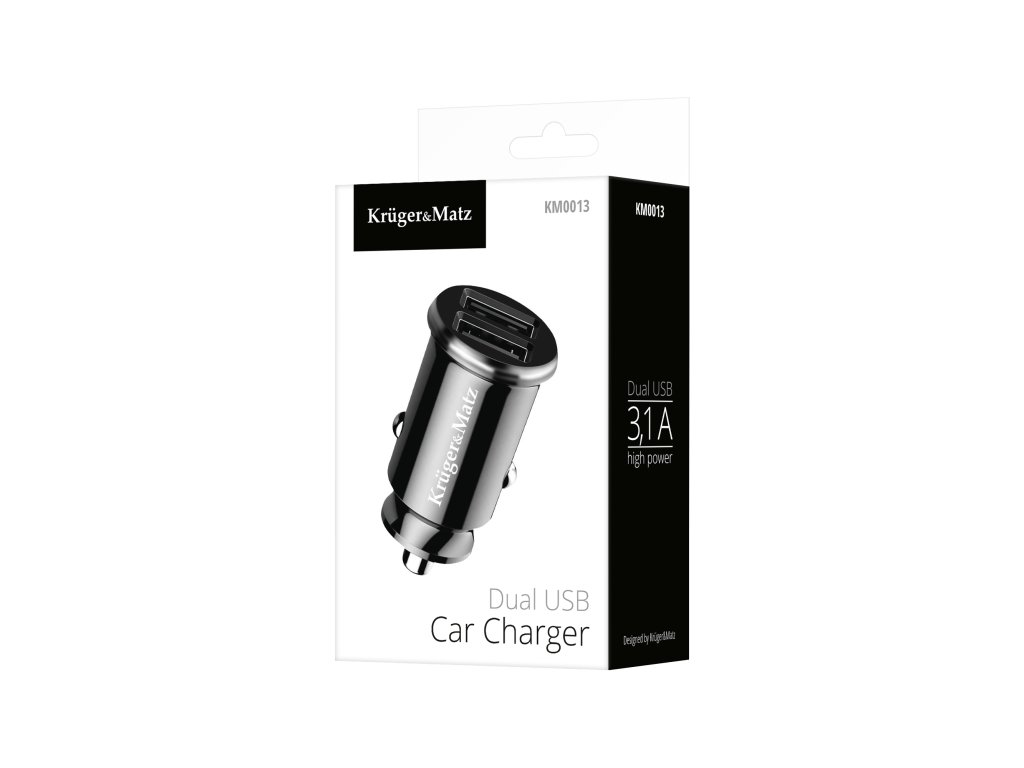 Auto punjač Kruger&Matz KM0030 opremljen je s dvije USB utičnice: prva s snagom od 1 A i druga s snagom od 3,1 A, što omogućava brzo i učinkovito punjenje dva uređaja istovremeno. Važno je napomenuti da dodatak ima i zaštitu protiv prenapona i prekomjernog punjenja.