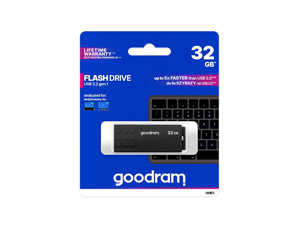 Specifikacija: Model: USB 3.0 UME3 Kapacitet: 32 GB Sučelje: USB 3.0 kompatibilno s USB 3.1, 3.0, 2.0, 1.1 Temperatura skladištenja: -25 - 85°C (preporučeno) Brzina čitanja: do 60 MB/s Brzina pisanja: do 20 MB/s Dimenzije: 55,0 x 21,0 x 9,6 mm Težina bez pakiranja: 9 g Izvor napajanja: Napajanje putem USB porta Radna temperatura: 0 - 70°C (preporučeno) Kompatibilno s operacijskim sustavima: Windows 2000 SP4 i noviji, macOS 10.5.x i noviji, Linux v.2.6.x i noviji Markirani USB flash disk GOODRAM s izbočenim protukliznim dizajnom za jednostavno otvaranje USB-a u svakoj situaciji. UME3 se odlikuje USB 3.0 standardom koji osigurava brzi prijenos podataka i jedinstven, klasičan dizajn.Glavne značajke USB stick poznate i cijenjene marke GOODRAM