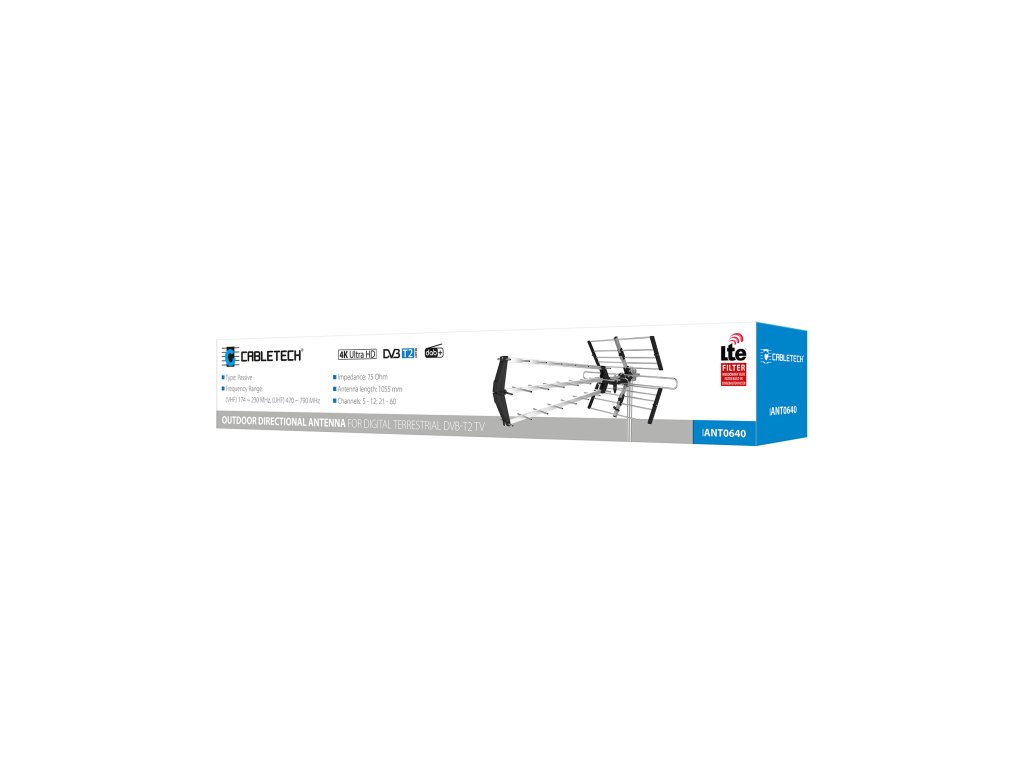 Vanjska usmjerivačka televizijska antena Cabletech je uređaj koji omogućuje prijem digitalnog zemaljskog televizijskog signala DVB-T i DVB-T2 na velikim udaljenostima, čak i u zahtjevnom terenu s visokim ometanjima. Antena radi u frekvencijskim pojasima VHF 174-230 MHz i UHF 470-790 MHz, što osigurava pravilan prijem visokokvalitetnog signala, omogućujući vam uživanje u izvrsnoj slici i zvuku vaših omiljenih serija ili filmova. Antena Cabletech također podržava VHF pojas što omogućuje prijem zemaljskih digitalnih televizijskih kanala smještenih na osmom multipleksu MUX 8. LTE filter upotrijebljen u ovom modelu eliminira ometanje LTE mreže koja utječe na kvalitetu zemaljskog televizijskog signala.