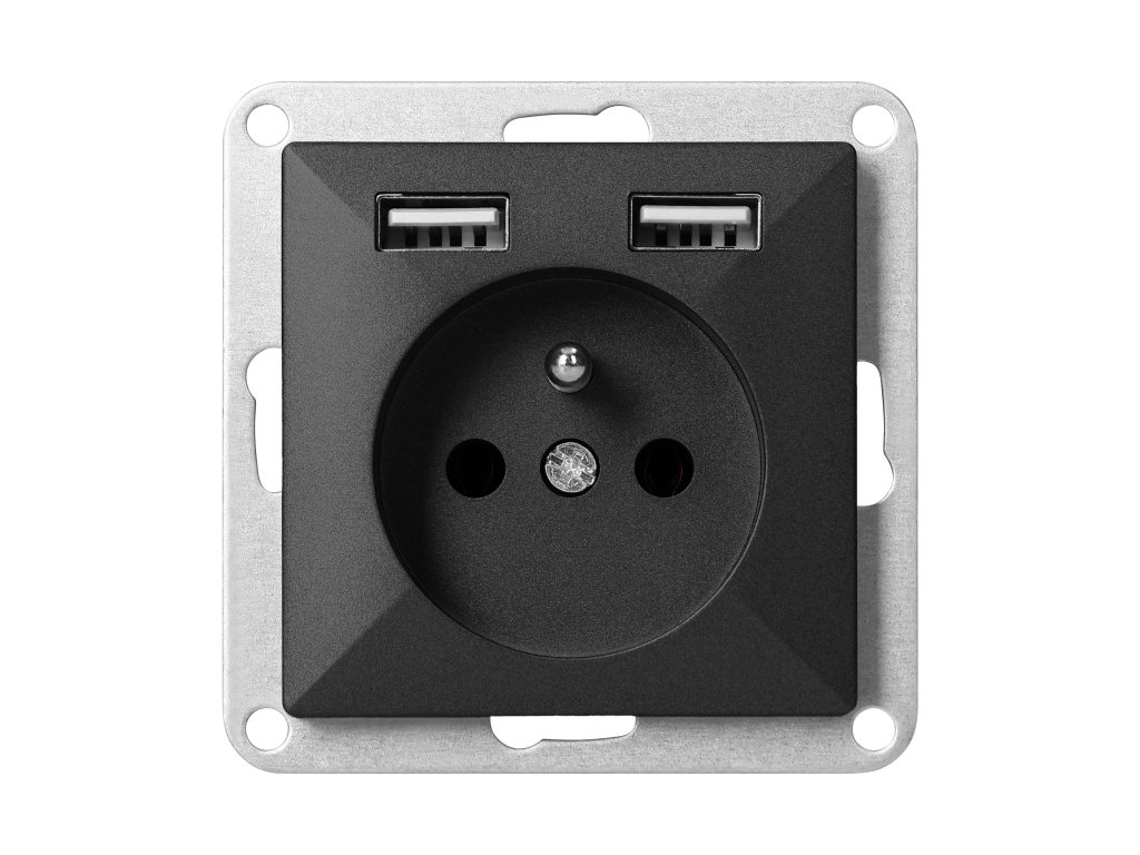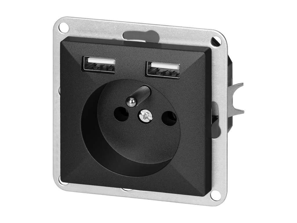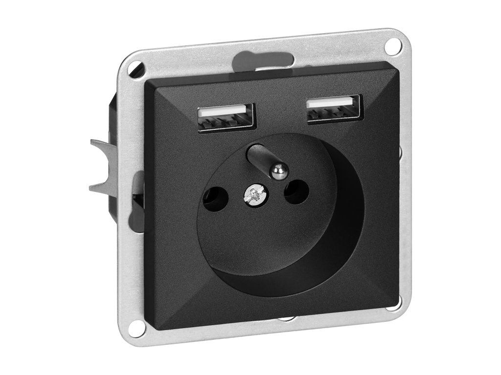 Modularna serija sa simetričnim sustavom okvirnih ploča (za 1-, 2-, 3-, 4-, 5-modula) omogućuje montažu proizvoda u horizontalnom i vertikalnom položaju. Moderni mehanizam brzog priključivanja (žice se priključuju umetanjem izravno u tijelo) osigurava sigurnu i pouzdanu instalaciju i uklanjanje žica. Utičnice su opremljene tradicionalnim vijčanim spojevima. Unutarnji dizajn stezaljki jamči siguran spoj žica od 0,75 mm do 2,5 mm . Čvrsta i robusna montažna ploča i visokokvalitetni samo-vraćajući elementi omogućuju stabilnu i sigurnu instalaciju u kutiji. Posebni fleksibilni elementi olakšavaju prilagodbu okvira tijelu.Jedna francuska utičnica tipa 2P+E, s USB punjačem tipa A (2xUSB-A, 2A, 5V). Namijenjeno za ugradbenu montažu. Sa ugrađenim USB punjačem možete jednostavno napuniti svoj telefon ili tablet. Treba se koristiti u unutarnjim prostorima (IP20).