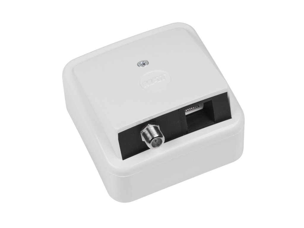 Univerzalna utičnica završena F utičnicom i računalnom utičnicom RJ45; tip SPA-FK s nagnutom utičnicom koja pruža debljinu od samo 27 mm za ugradnju u ravnini;dimenzije 75x75 mm i visina 52 mm/površina ili 27 mm/površina;