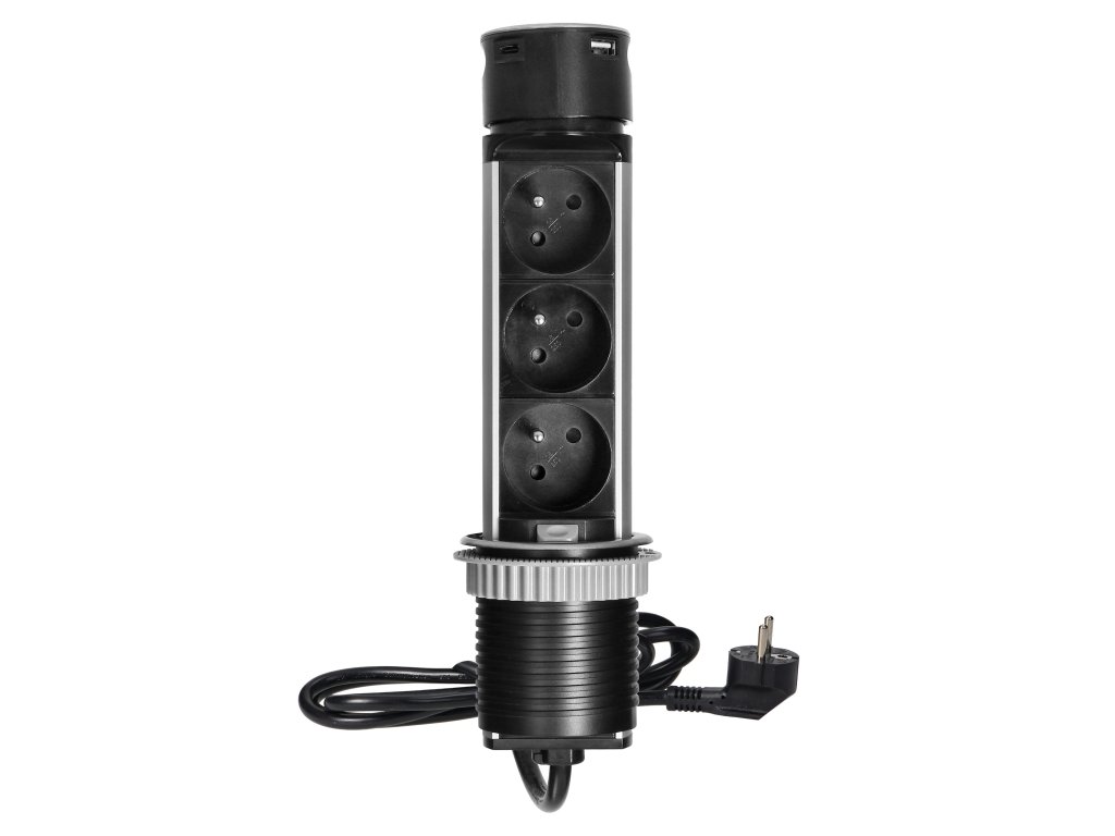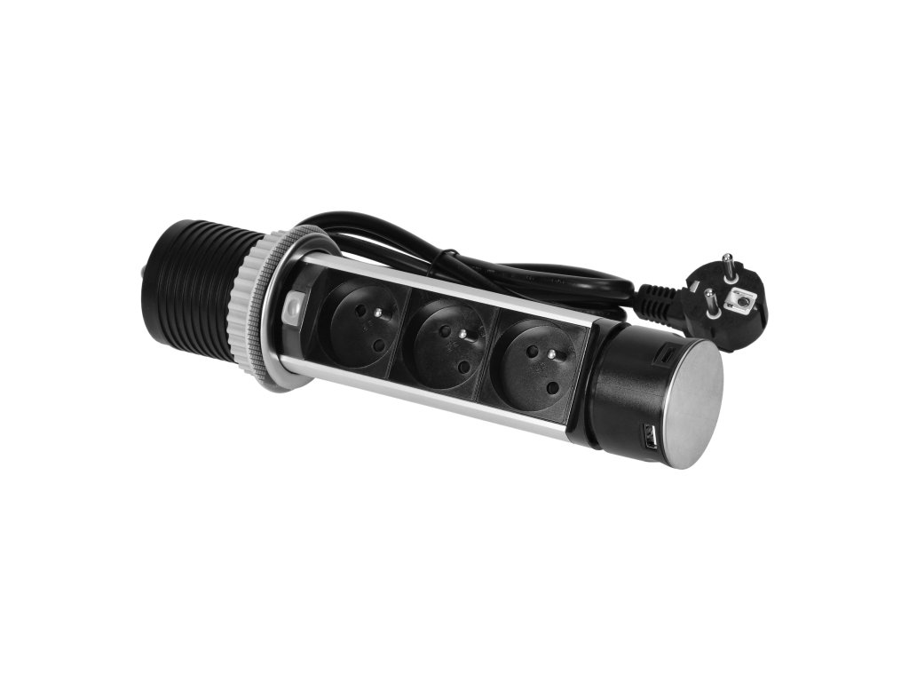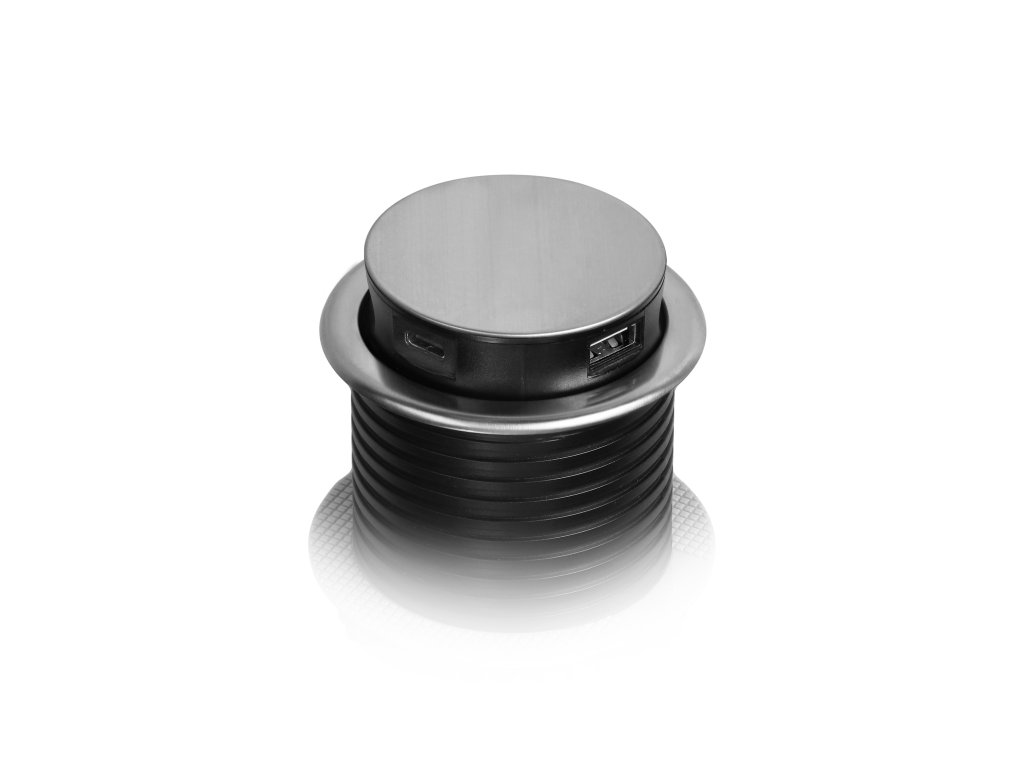 Elegantna i izdržljiva utičnica od nehrđajućeg čelika. Omogućuje nam istovremeno spajanje 3 uređaja napajana na 230 V i punjenje dva mobilna uređaja. Idealna je za konferencijske sobe. Za instalaciju je dovoljan jedan otvor promjera 6 cm.