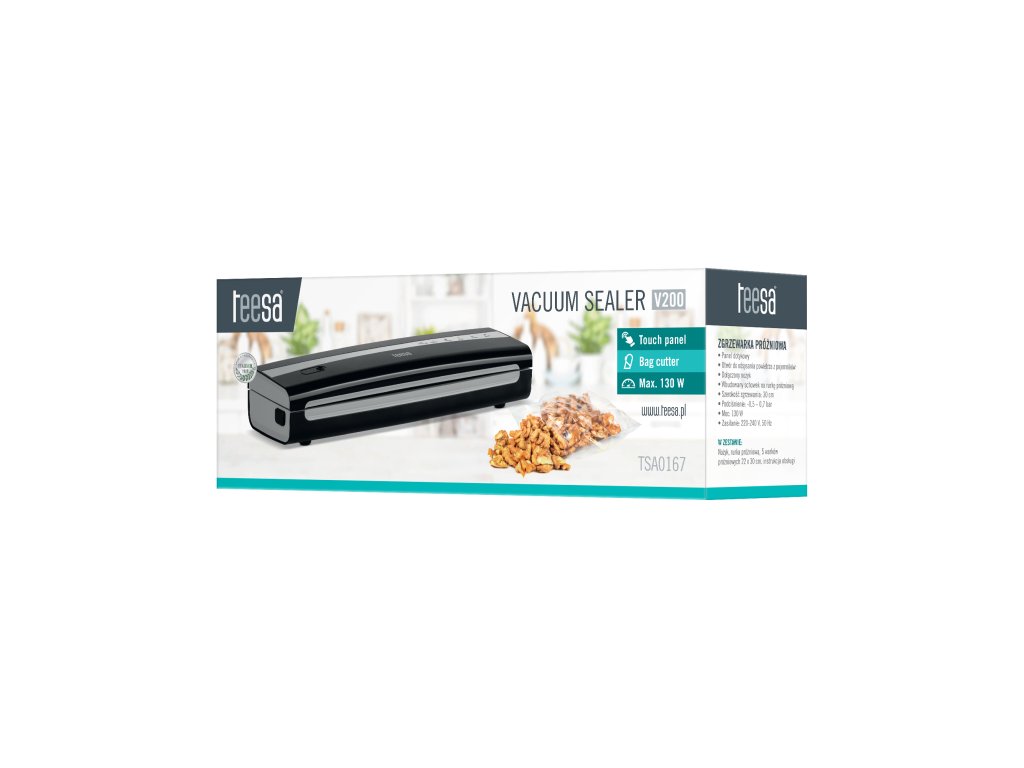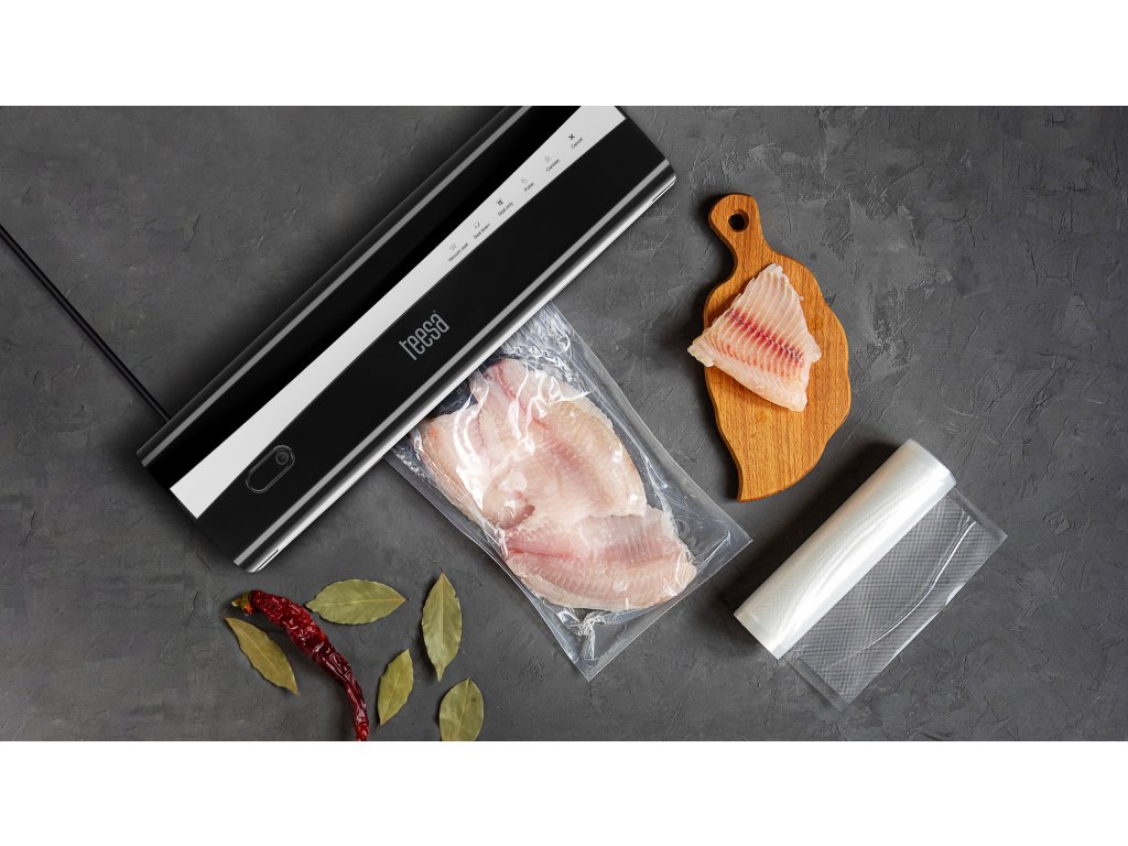 Vakuumski zavarivač Teesa je jednostavan za korištenje uređaj snage 130 W, koji ne samo da omogućava brzo vakuumsko pakiranje hrane uz vakuum sa tlakom do 0,7 bara, nego i zahvaljujući priloženoj cijevi omogućava isisavanje zraka iz posuda. Ako trebate samo čvrsto zatvoriti vrećicu, funkcija zatvaranja će vam u tome pomoći.