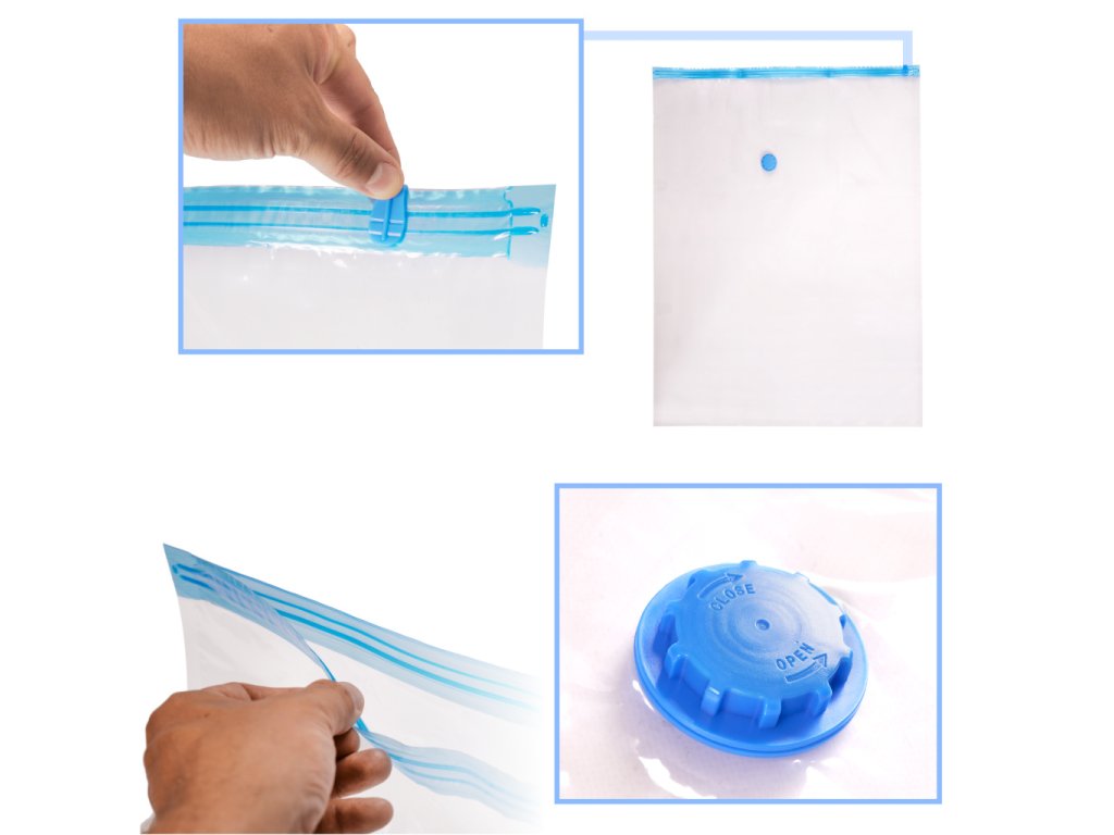 Používanie vákuových vriec je naozaj jednoduché. Po uložení vybraného predmetu je potrebné vrecko uzavrieť pomocou západky. A potom pomocou pumpičky alebo trubice vysávača nasajte vzduch cez vyčnievajúcu časť vrecka. A máte hotovo!