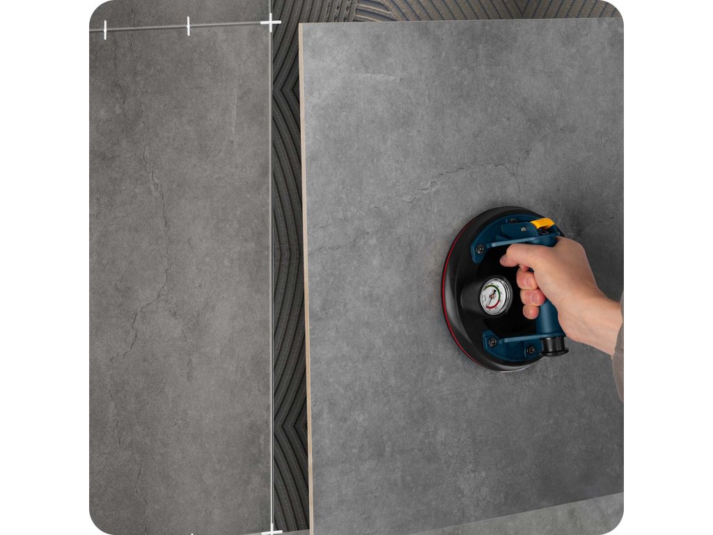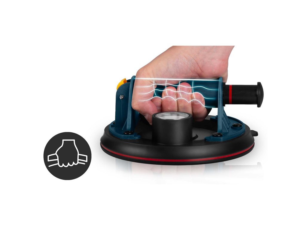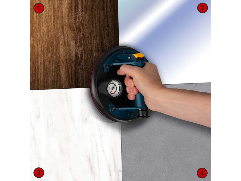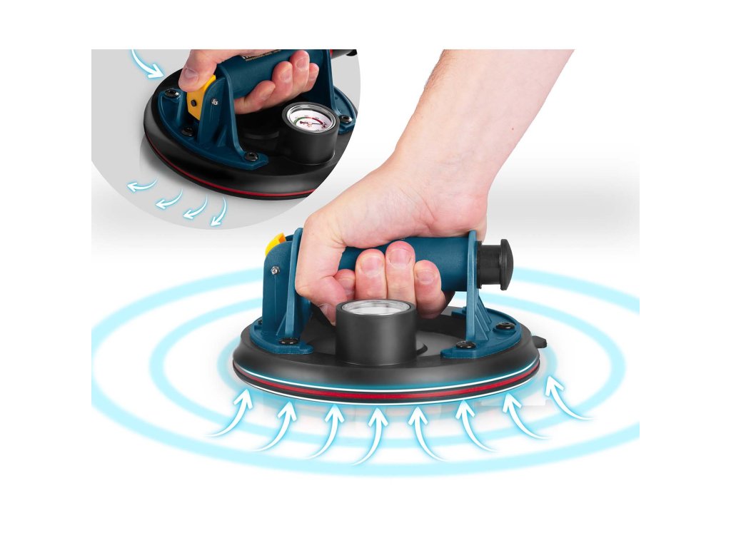 Nakon postavljanja na glatku površinu, ručna pumpa isisava zrak ispod gumenog diska. Stvara se snažan podtlak koji je stabilno "lijepi" na materijal.