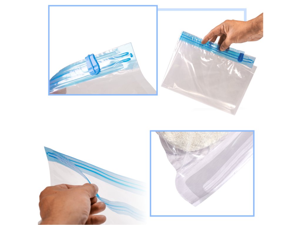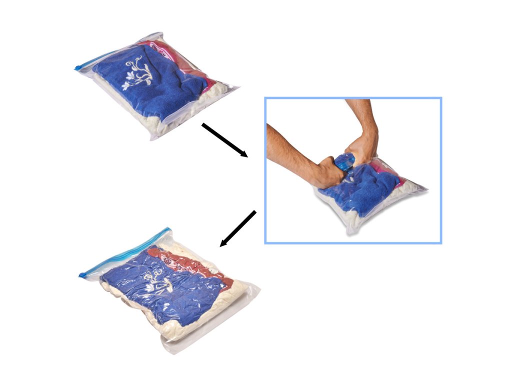 Korištenje vakuumskih vrećica zaista je jednostavno. Prvo stavite odabrane stvari u vrećicu i zatvorite je patentnim zatvaračem. Zatim pomoću pumpe ili cijevi usisavača isisajte zrak kroz izbočeni dio vrećice. I to je to, vaše stvari već zauzimaju manje prostora!