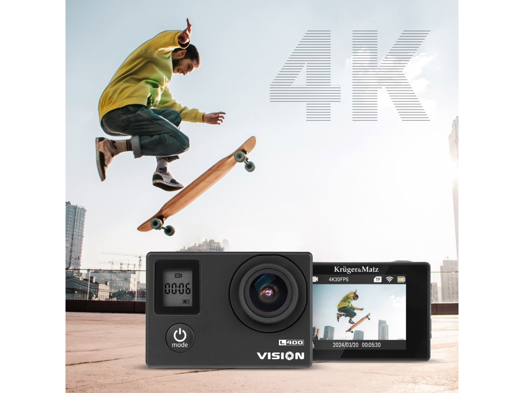 Sportska kamera Kruger&Matz Vision L400 omogućuje vam snimanje videozapisa u 4K kvaliteti pri 30 sličica u sekundi. Uređaj također podržava H.265 kodek! Takvi parametri jamče da ćete uhvatiti svaki detalj svojih najuzbudljivijih avantura.