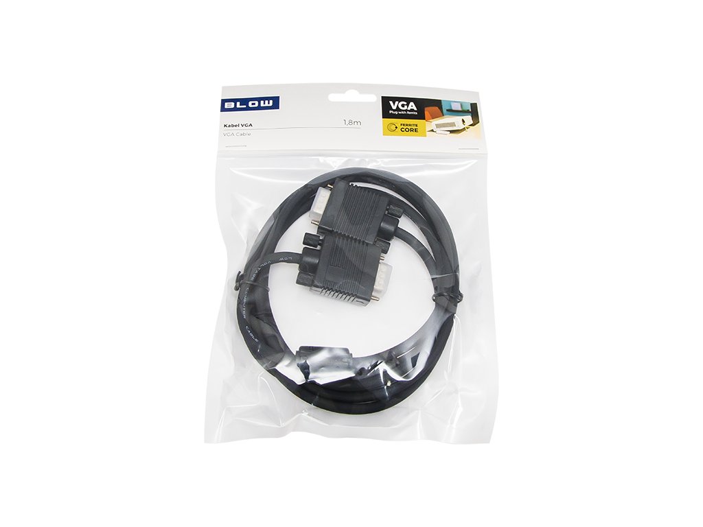 VGA - priključak VGA (D-SUB 15 pinova) namijenjen prijenosu analognog signala s računala na projektore, televizore i LCD, CRT i plazma monitore. Kabel je izrađen od crnog kabela otpornog na lomljenje.Specifikacija:- Priključak: VGA (muški) na VGA (muški)- Kabel: crni, okrugli, otporan na savijanje- Feritna jezgra: x2 - Prijenos signala: VGA, SVGA i XGA- Kompatibilnost: s uređajima s VGA priključkom (D-SUB 15 pinova)- Vanjske dimenzije priključaka: 33x16 mm visina, 41(46,5) mm- Duljina kabela: 1,8 m.