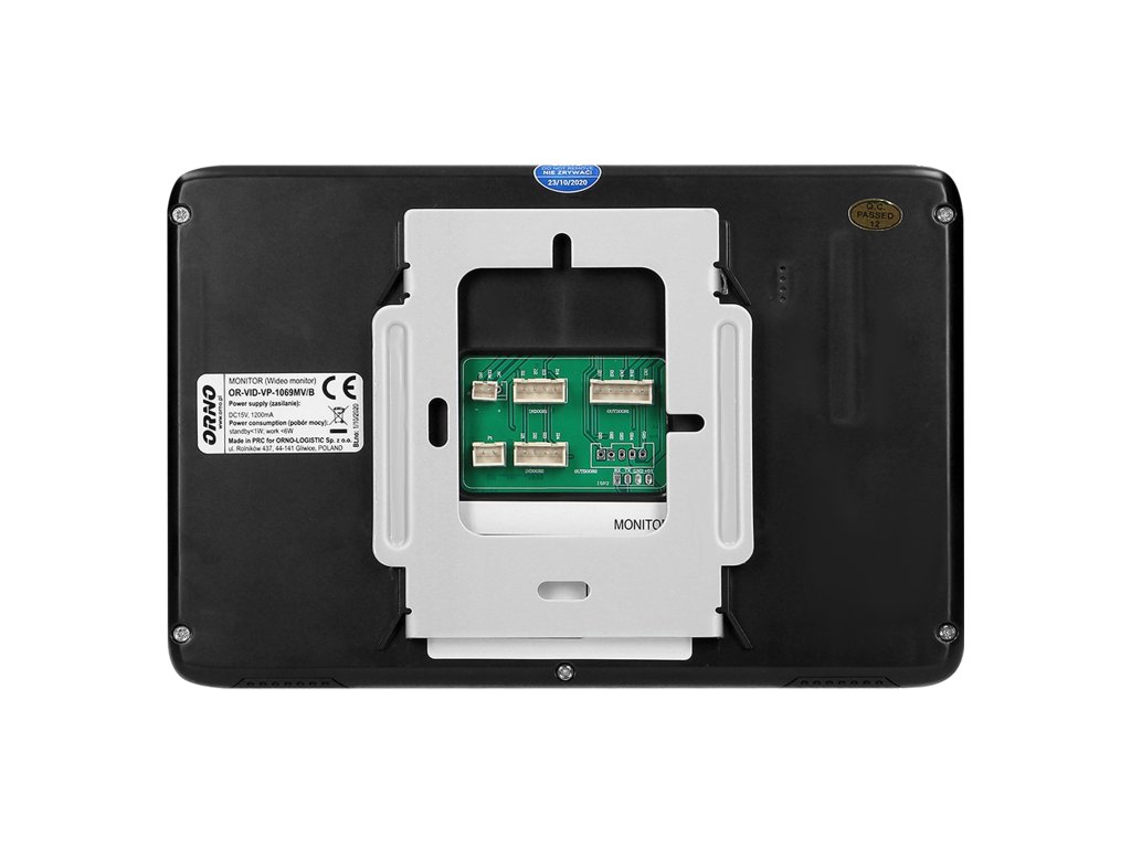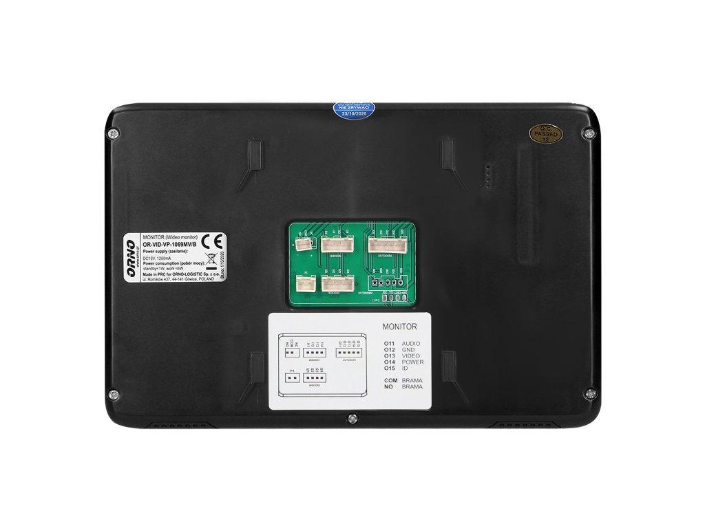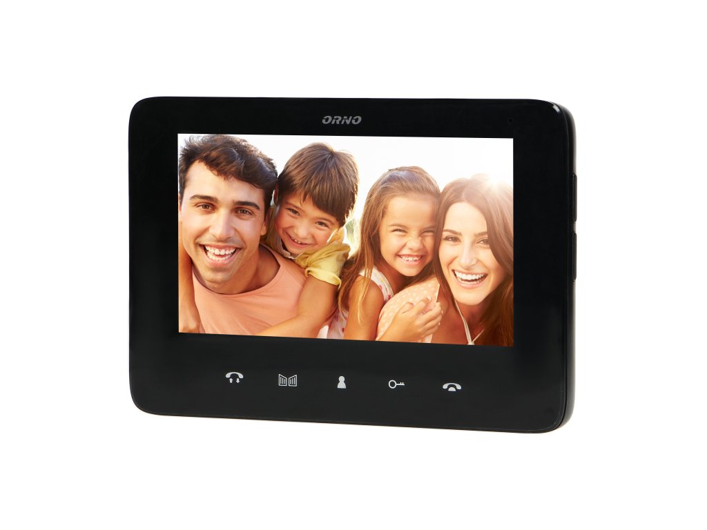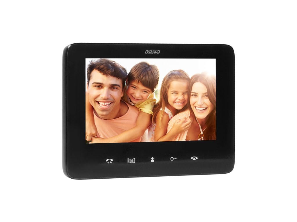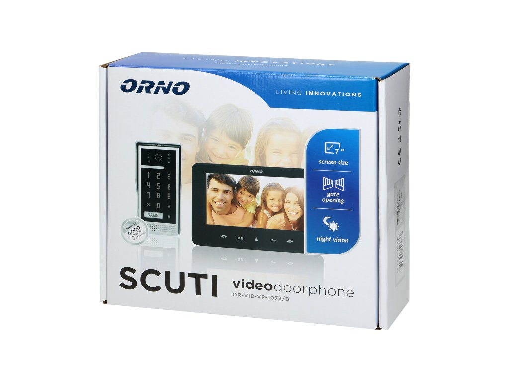 Videonadzornik SCUTI sadrži višebojni, vrlo plosnati 7" LCD monitor s dodirnom pločom i osvijetljenim tipkama. Parametri monitora (svjetlina i boja, glasnoća govora i zvonjave) mogu se podesiti. Na raspolaganju je 16 zvonjenja. Vanjska jedinica s CMOS kamerom prikladna je za površinsku montažu. Ima zaštitnu nadstrešnicu, pločicu s imenom i infracrvene diode koje osiguravaju izvrsno noćno gledanje. Vanjska jedinica dodatno ima osvijetljenu numeričku tipkovnicu (kodna brava), koja omogućuje pristup samo ovlaštenim posjetiteljima. Set podržava otvaranje vrata, a ako na njega spojite dodatni monitor, možete aktivirati funkciju interkoma. Izvor istosmjernog napajanja iz jedinice u električnu utičnicu (15 V DC) ili opcionalno iz napajanja za DIN letve (OR-VID-VP-1009ZD). Električni udar pogodan za 12V DC i potrošnju energije max. 300 mA ne zahtijeva dodatni izvor napajanja.Tehnička specifikacija: