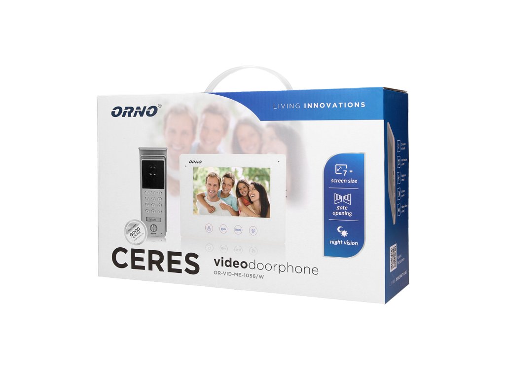 Videoparlafon CERES 7" bijeli opremljen je vrlo tankim LCD monitorom s mogućnošću glatkog podešavanja parametara (svjetlina, kontrast boje, ton glasnoće i razgovor), 16 odabranih zvona, dodirnom pločom s osvijetljenim gumbima i dodatnom funkcijom kontrole vrata. Vanjska jedinica s CMOS kamerom zahtijeva površinsku montažu. Opremljena je infracrvenim osvjetljenjem koje omogućuje noćni vid i osvijetljenim mjestom za ime. Tipkovnica s brojevima omogućuje otvaranje brave pomoću koda. Napajanje jednosmjernim tokom iz napajanja na 15 V DC. Električni brava ne zahtijeva dodatno napajanje.Tehnička specifikacija: