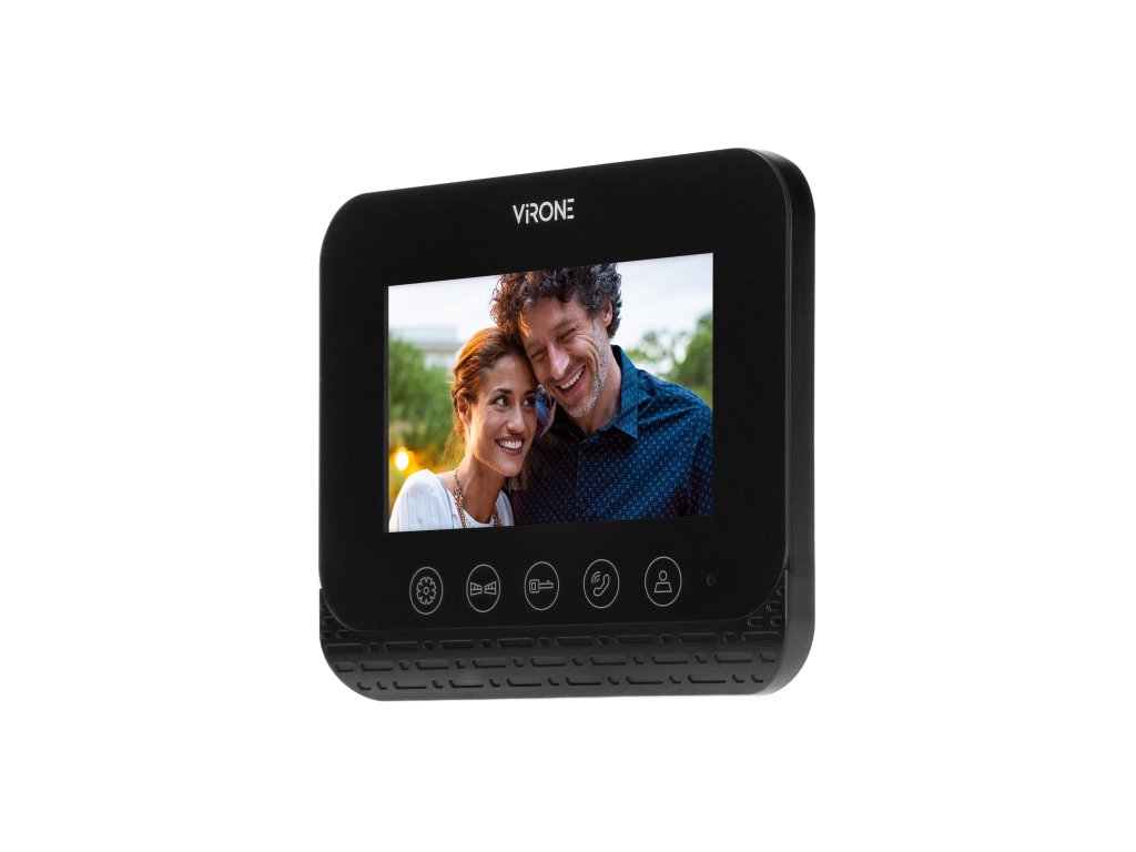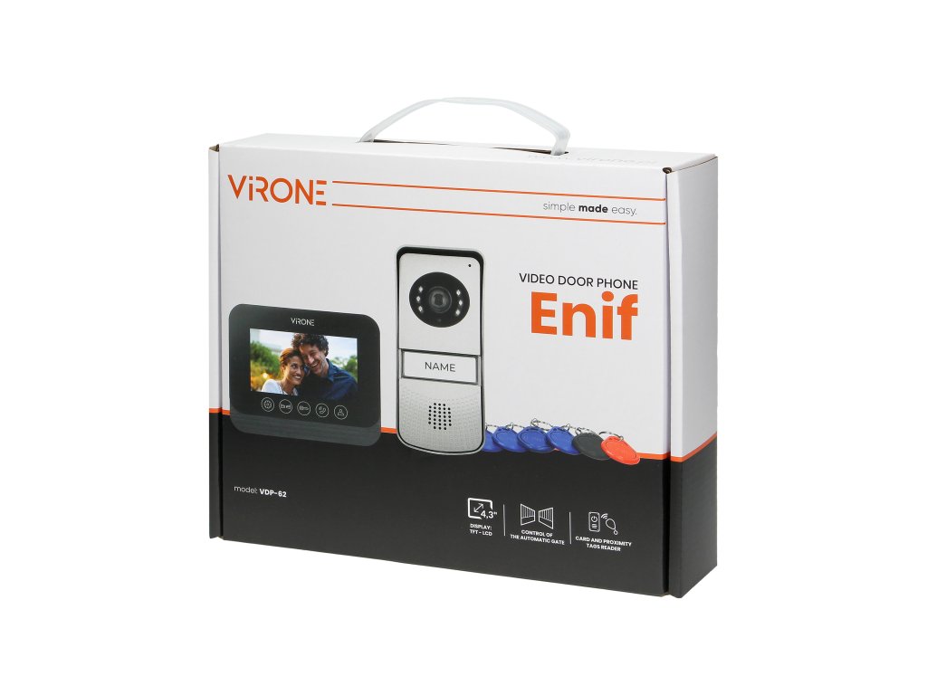 Videoportafon ENIF crni set ENIF namijenjen je za instalaciju u obiteljskim kućama i ne zahtijeva nikakvu slušalicu. Set uključuje višebojni plosnati 4,3" LCD monitor koji se upravlja putem funkcijskih tipki na dodir, i robusnu vanjsku jedinicu s čitačem beskontaktnih oznaka. Infracrveno osvjetljenje osigurava izvrsnu noćnu vidljivost. Glatko podešavanje parametara monitora i 6 zvona na izbor su velike prednosti ovog seta. Set podržava otvaranje vrata i zaključavanje vrata koji su napajani izravno s vanjske jedinice. Proširenje seta s dodatnim monitorom omogućuje interkom komunikaciju između monitora.Tehnička specifikacija: