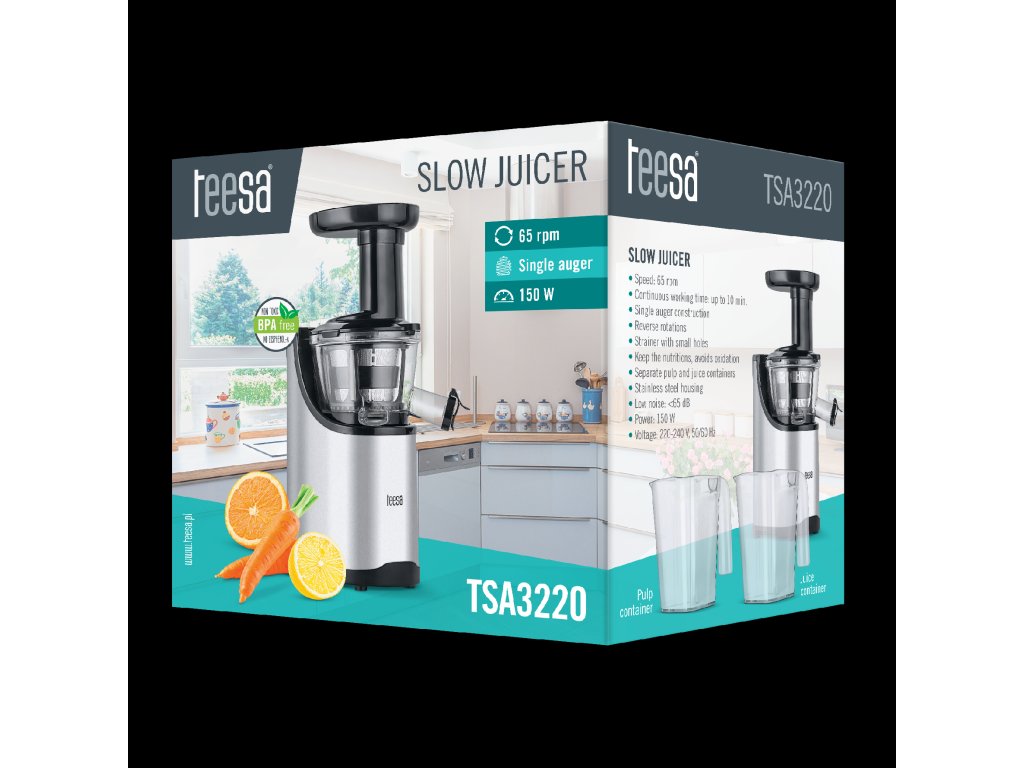 Volite li započeti dan s dozom vitamina Sigurno ćete zavoljeti polako radnu sokovnicu za voće i povrće Teesa. Uređaj ne sadrži BPA – to znači da je proizveden bez materijala koji sadrže bisfenol, što je iznimno važno za zdravstvene učinke iscijeđenog soka. Zahvaljujući vertikalnom dizajnu i kućištu od nehrđajućeg čelika, sokovnik ne zauzima puno prostora na radnoj površini i savršeno se uklapa u uređaje moderne kuhinje.