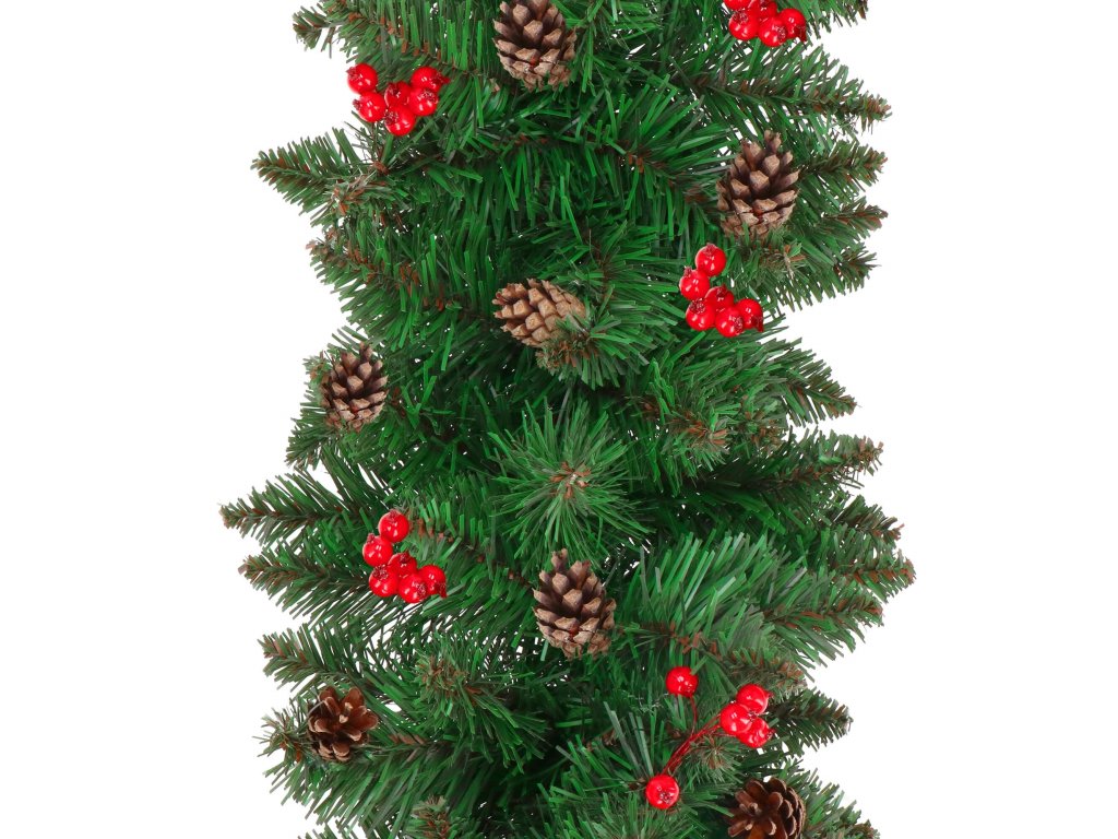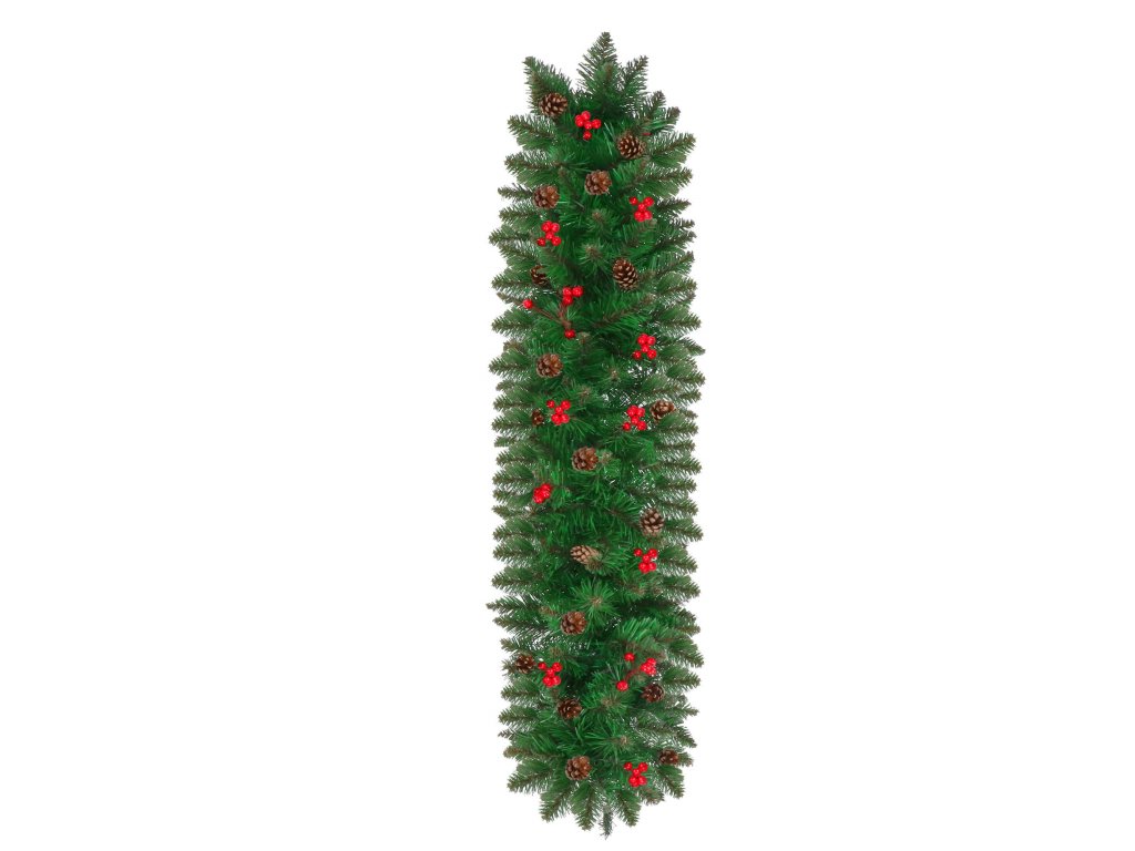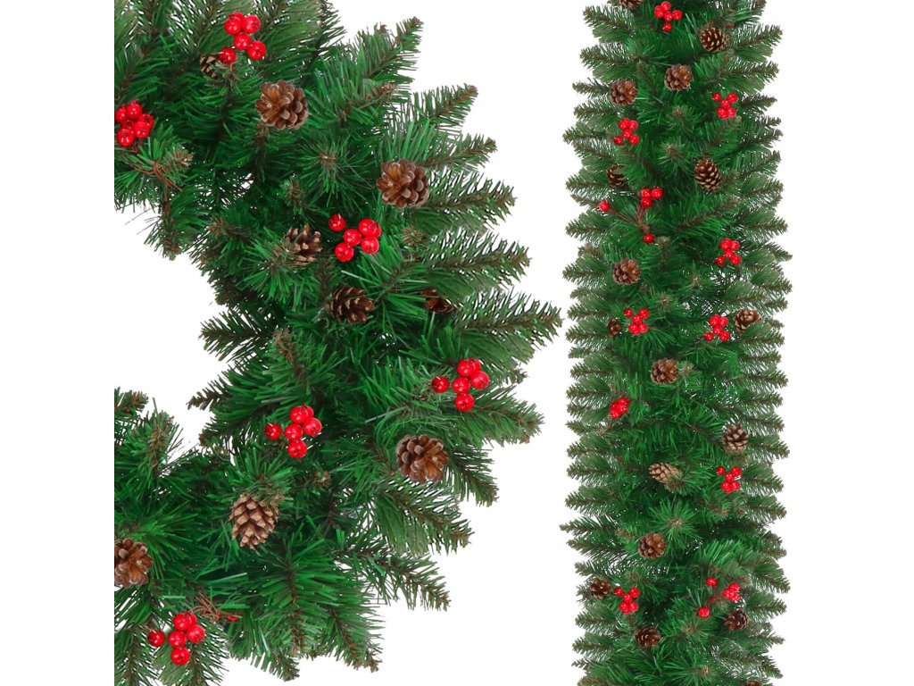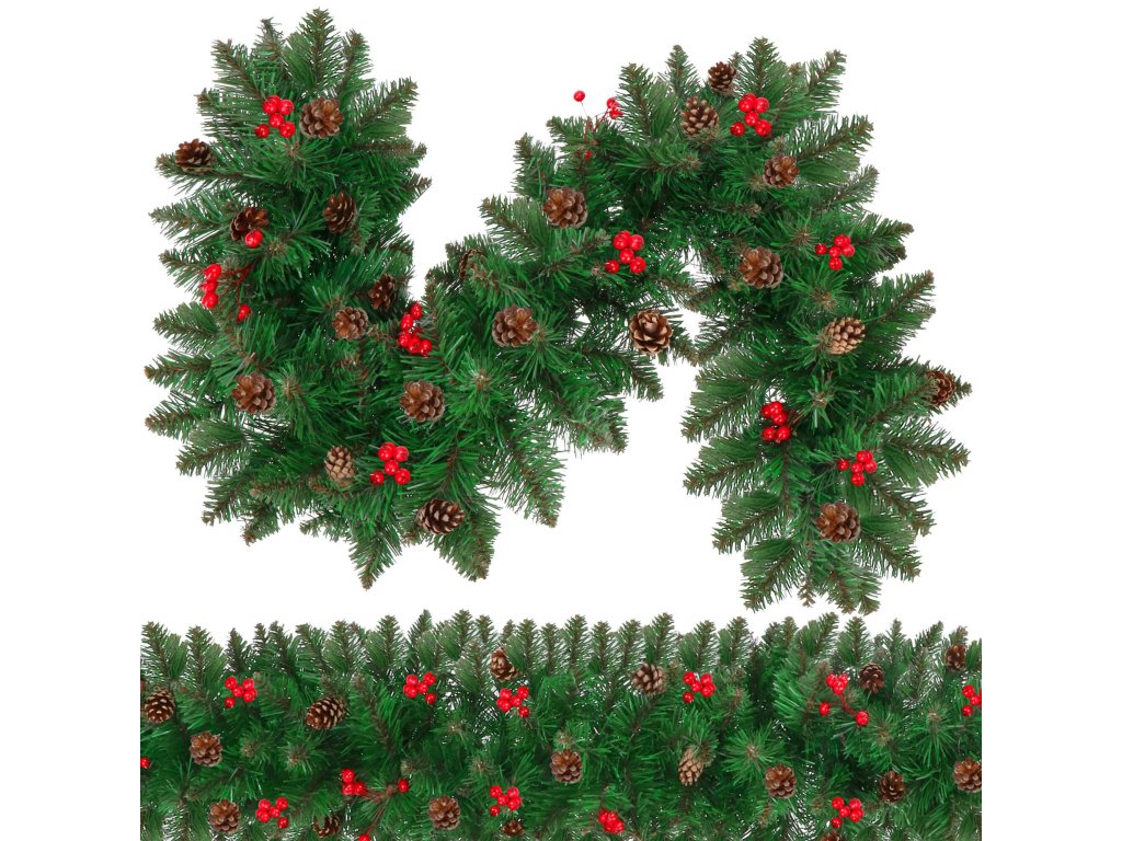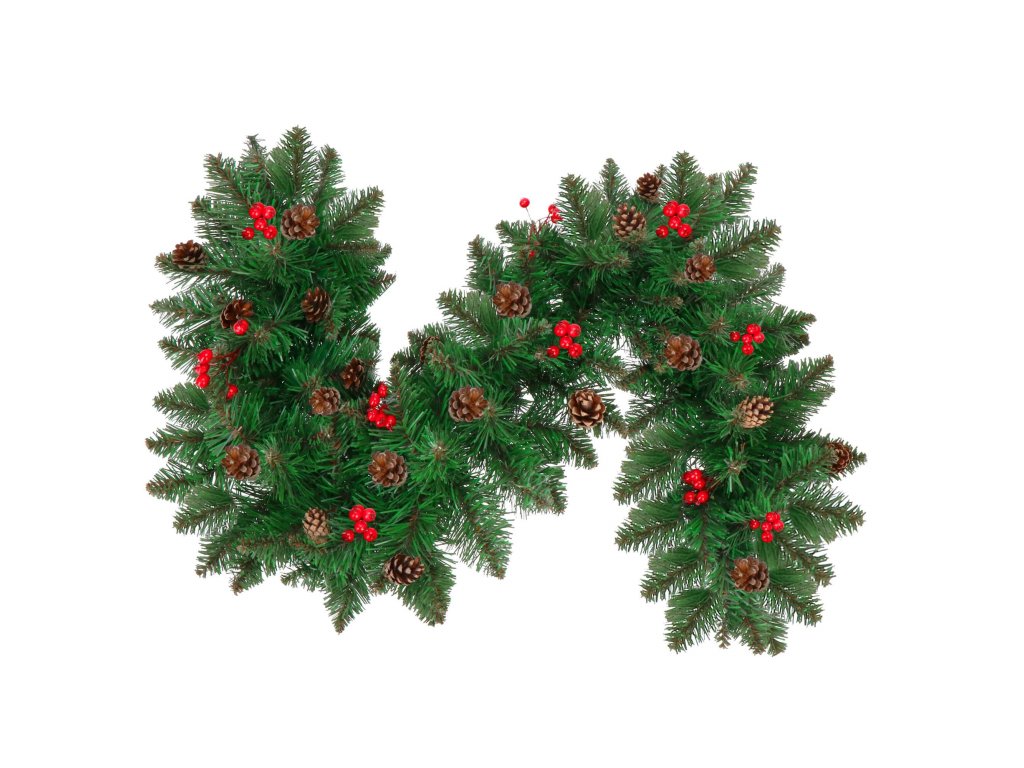 - Girlanda sadrži umjetne grančice četinjača s PVC iglicama i ukrase: prirodne češere i umjetne bobice crvenog ribizla