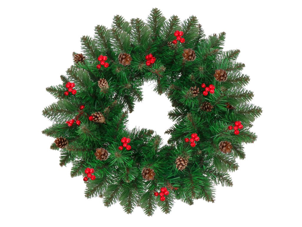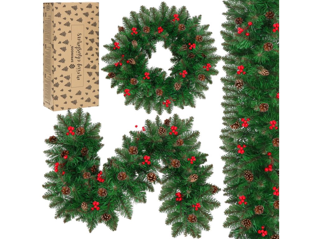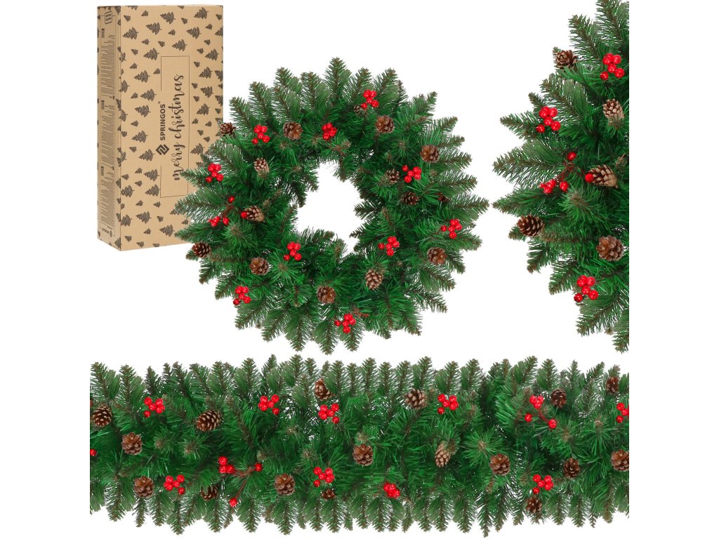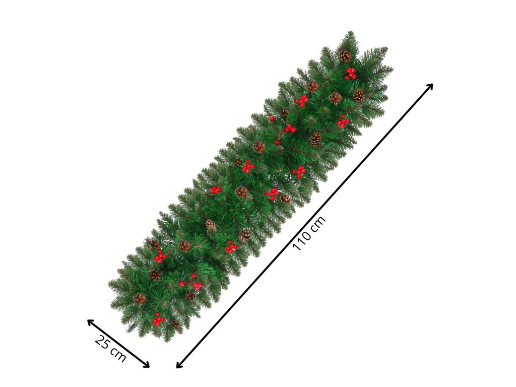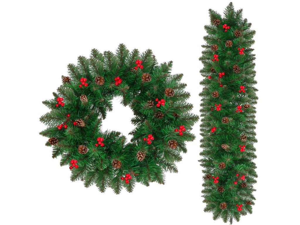 - Girlanda sadrži umjetne grančice četinjača s PVC iglicama i ukrase: prirodne češere i umjetne bobice crvenog ribizla