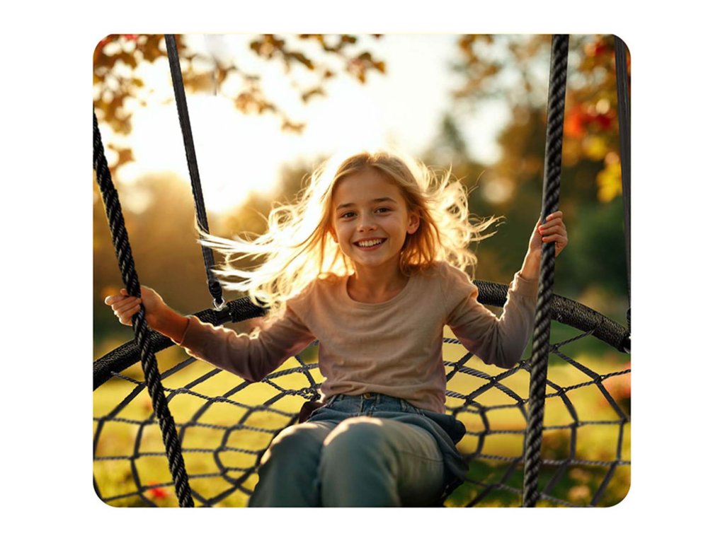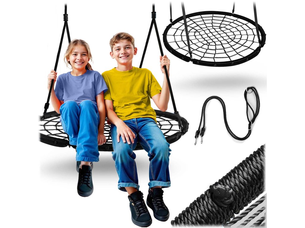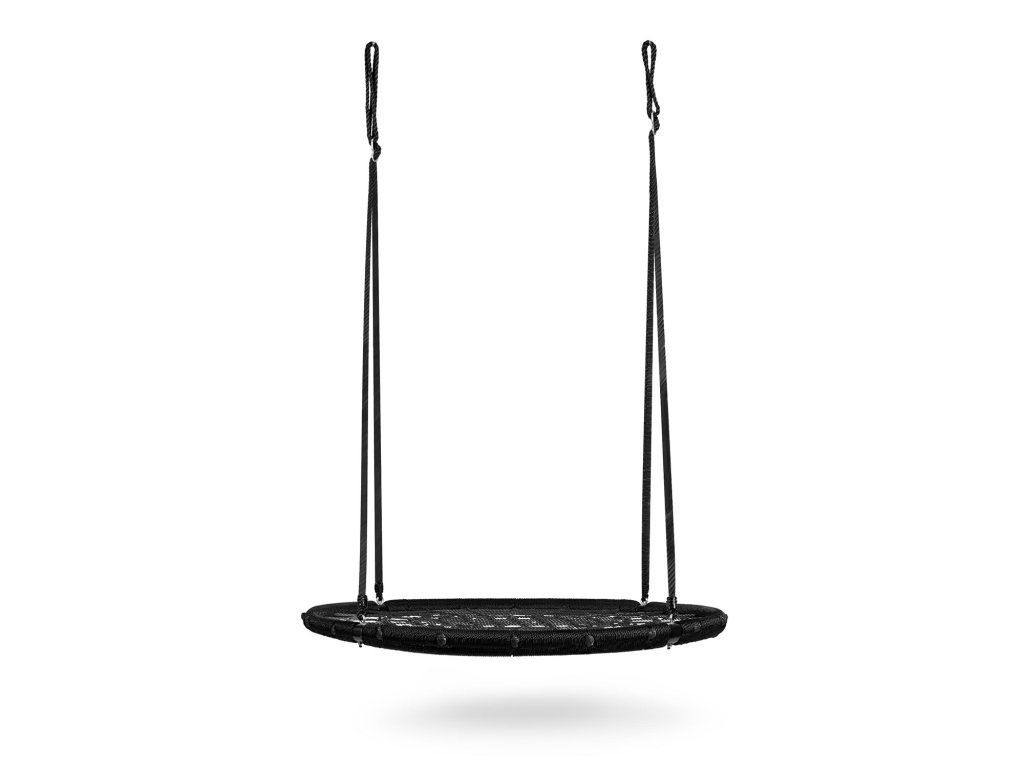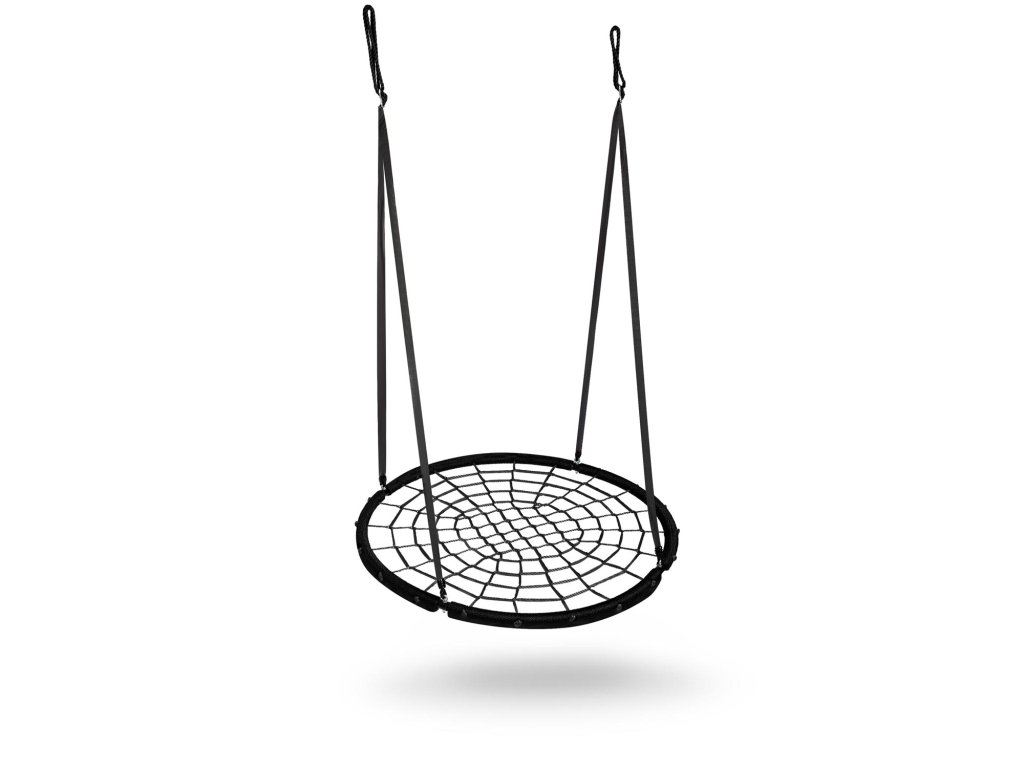 Ljuljačka na čeličnom okviru prekrivenom zaštitnim pletenjem, od jakih užadi s mrežom paukove mreže i debelim visećim užadima. Osigurava sigurnost, stabilnost i dugovječnost.