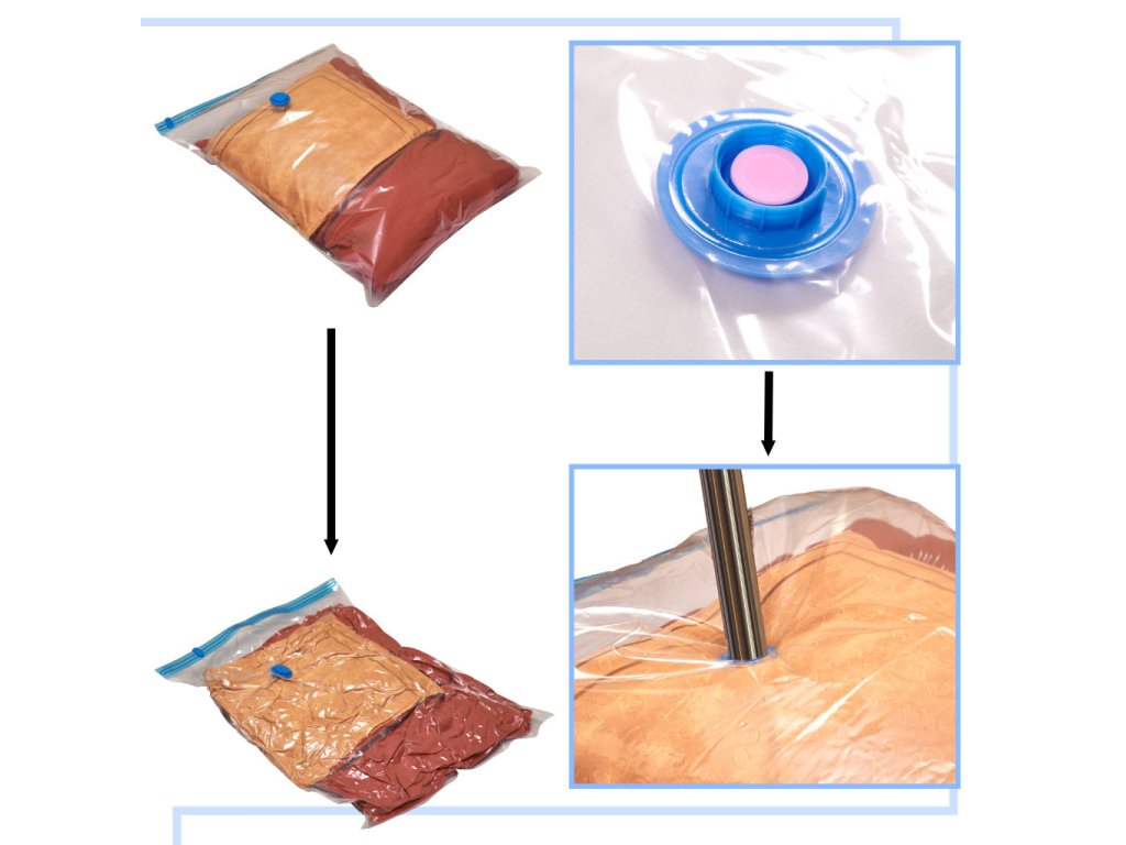 Korištenje vakuumskih vreća je zaista jednostavno - ne zahtijeva nikakve složene alate. Najprije stavite odabrane predmete u vreću i zatvorite pomoću patentnog zatvarača. Zatim upotrijebite pumpu ili usisnu cijev da izvučete zrak. I to je to, vaše stvari zauzimaju manje mjesta!