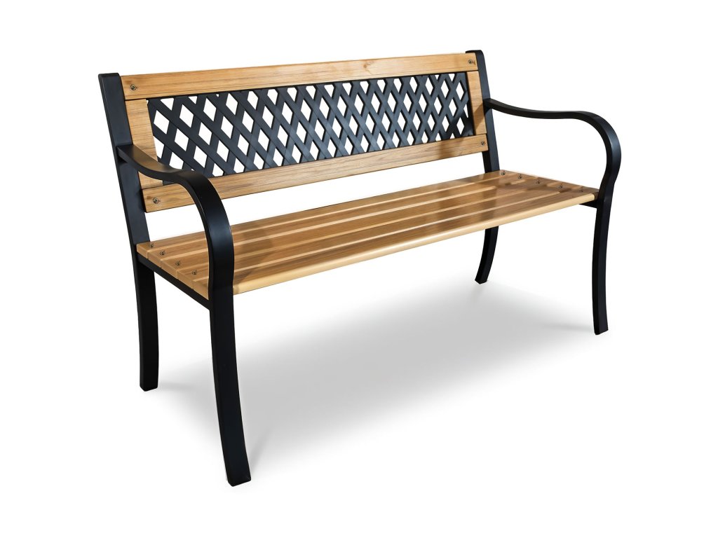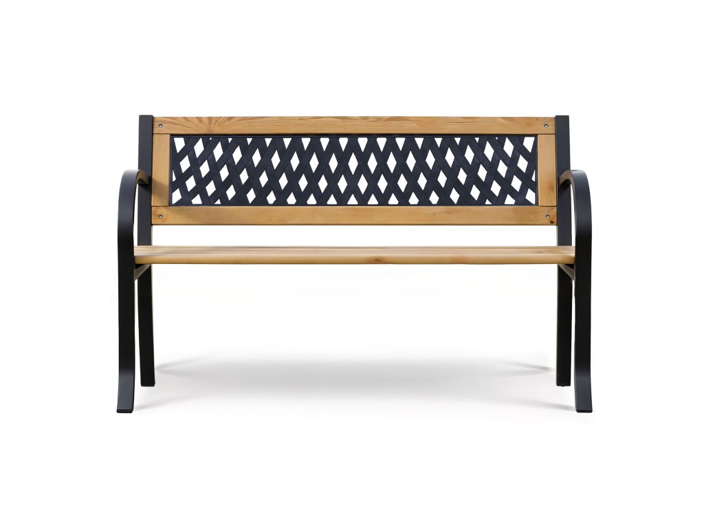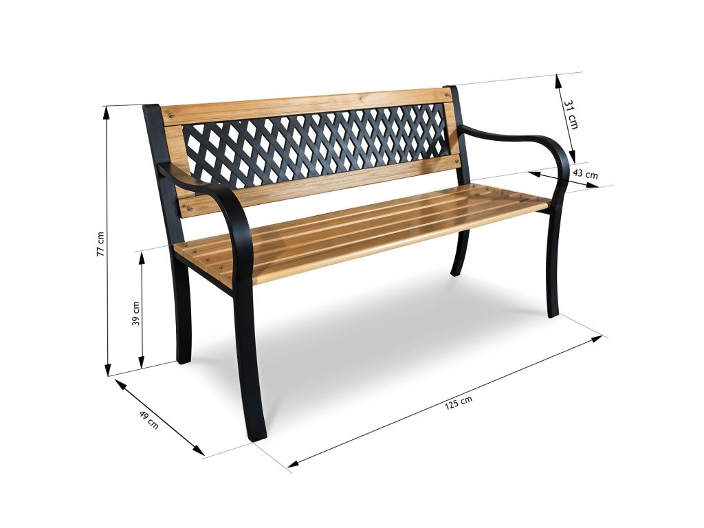 - čelik (okvir plastificirano lakiran) + drvene letvice naslona i sjedišta, plastika (ispuna naslona) ukupna duljina: 125 cm