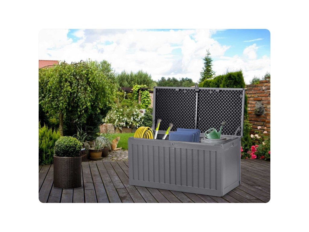 Prostrana vrtna kutija olakšava spremanje neophodnih stvari koje svakodnevno koristimo (jastuci, madraci, pokrivači, igračke, alati) i mnogih drugih stvari u vrtu, na balkonu i oko kuće.