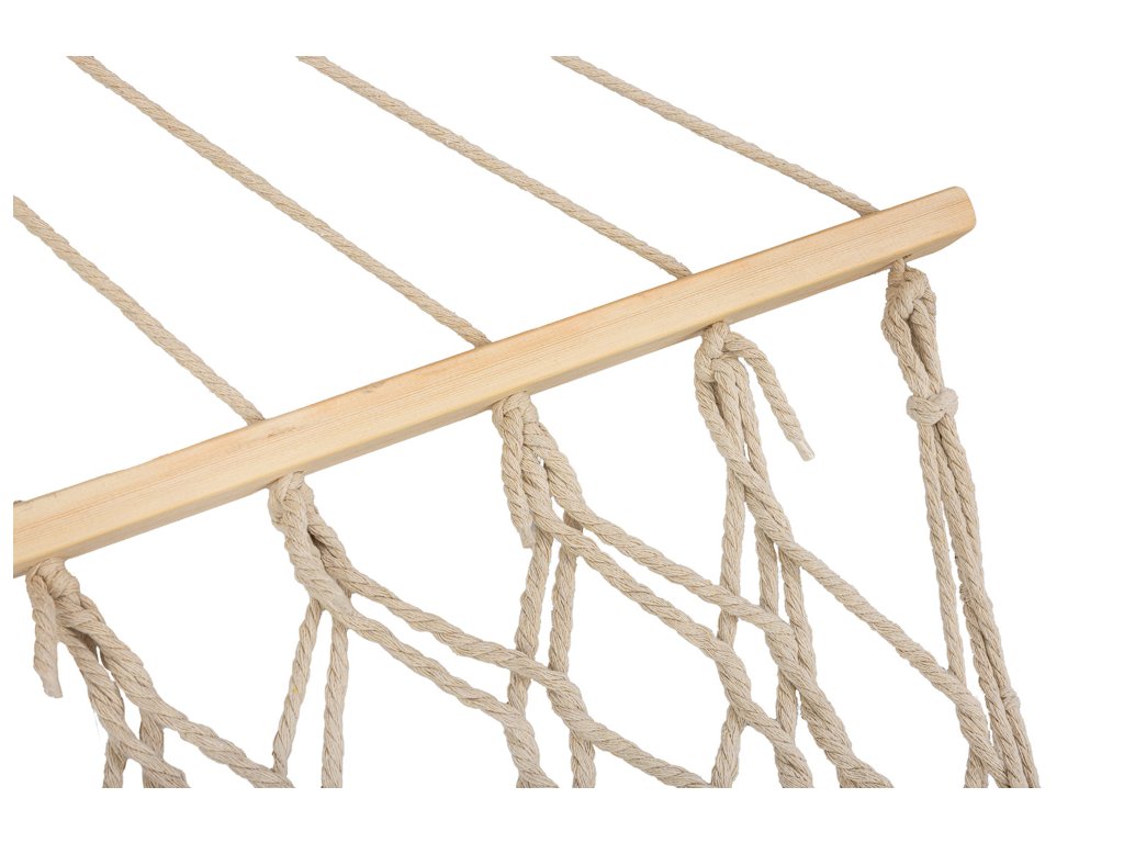 Viseća mreža je izrađena od gustih pamučnih užadi (65 %), koja joj dajuvisoku otpornost. Bez problema nosi težinu do 250 kilograma. Svijetla bež boja i resice na rubovima daju joj elegantan izgled, koji se savršeno uklapa u svaku vrtu. Viseća mreža je obješena na 100 centimetara širokom drvenom okviru, koji nudi dovoljnu stabilnost i udobnost. Kad se smota, zauzima vrlo malo prostora, pa se lako skladišti.