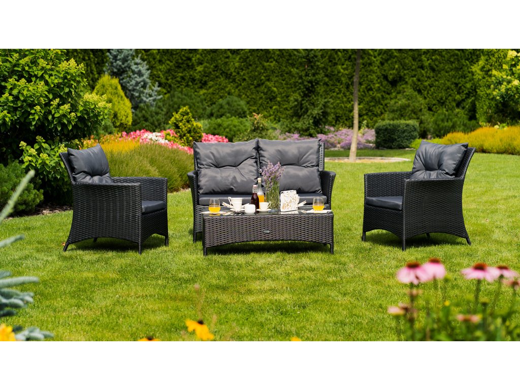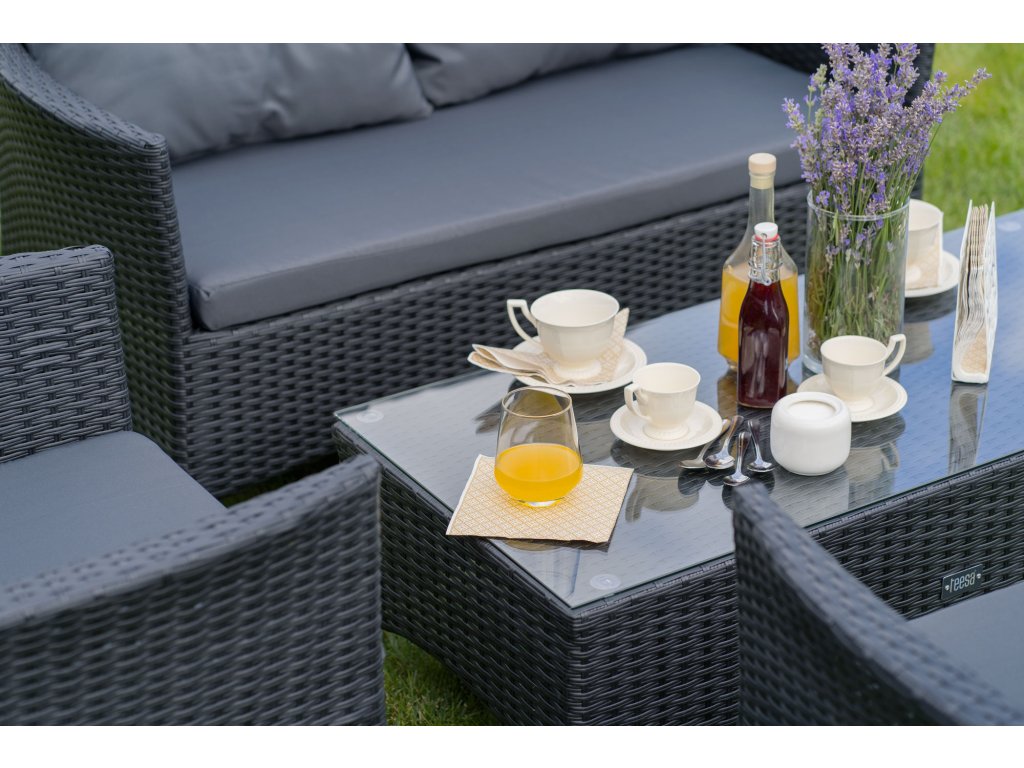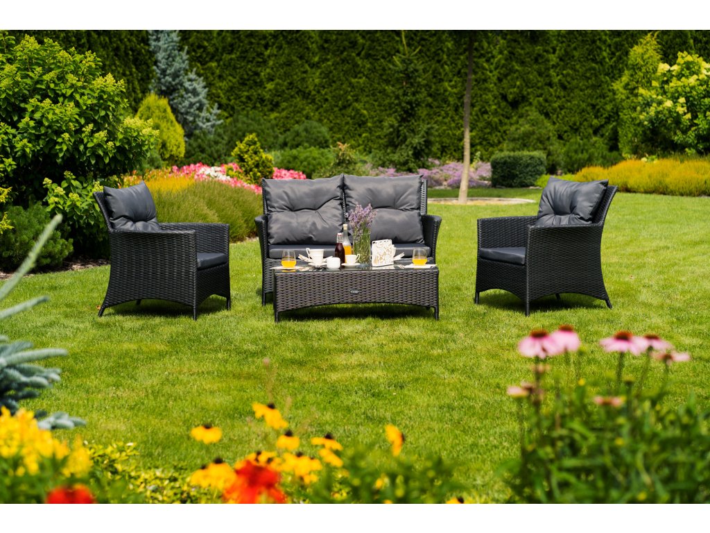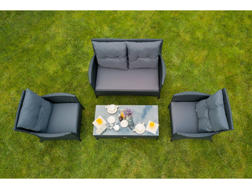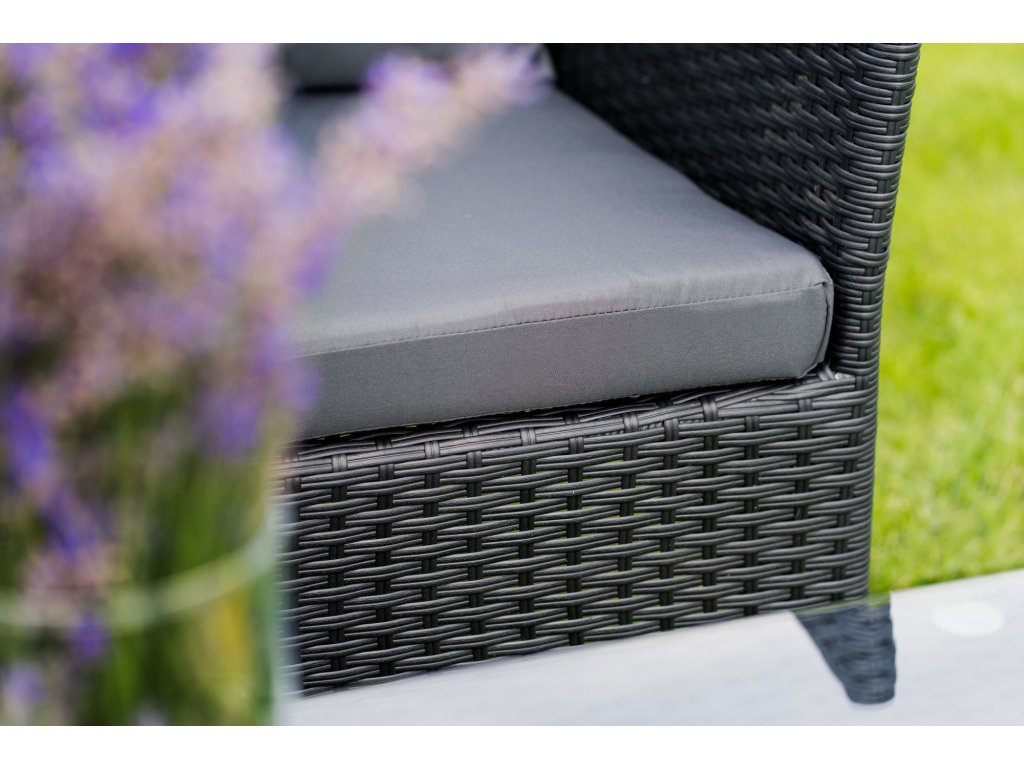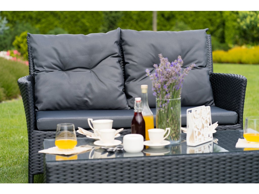 Vrtni namještaj Lily 2 odlikuje se čvrstom i otpornom konstrukcijom i visokim komforom korištenja. Izuzetno praktično rješenje je korištenje ploče od kaljenog stakla, zahvaljujući kojoj možete bezbrižno položiti vruća jela na vrtni stol. Mekani vrtni jastuci postavljeni na foteljama i dvosjedu značajno povećavaju udobnost tijekom ljetnog odmora i opuštanja. Važno je napomenuti da osim sjednih jastuka u ovom setu također dolaze jastuci za naslone.