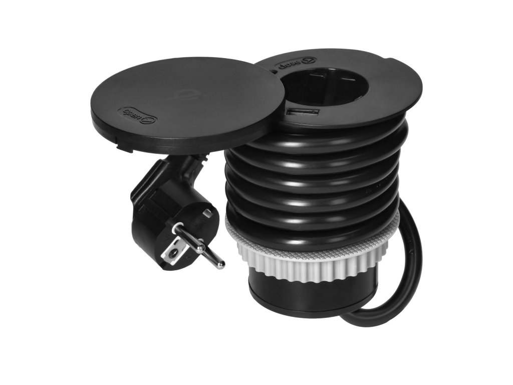 Pohodlná a ľahko použiteľná Vstavaná zásuvka s otočným vekom. Na nabíjanie telefónu alebo iného mobilného zariadenia nepotrebujeme otvárať zásuvku – kryt slúži aj ako indukčná nabíjačka. Po otvorení môžeme okrem dvoch zariadení nabíjaných cez USB kábel pripojiť aj jedno zariadenie na 230V (zásuvka Schuko). Ideálne pre domáci stôl alebo pracovisko.