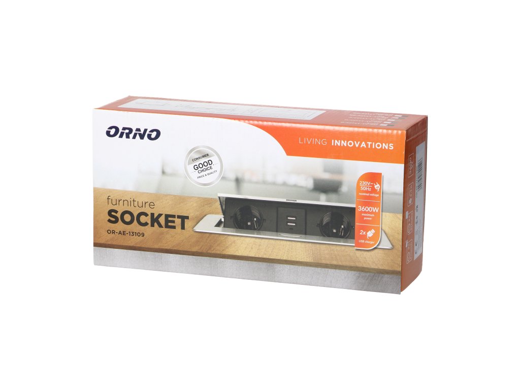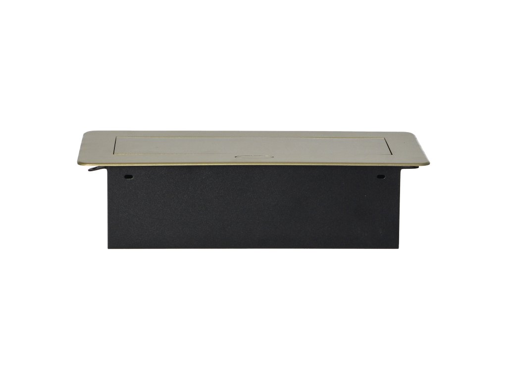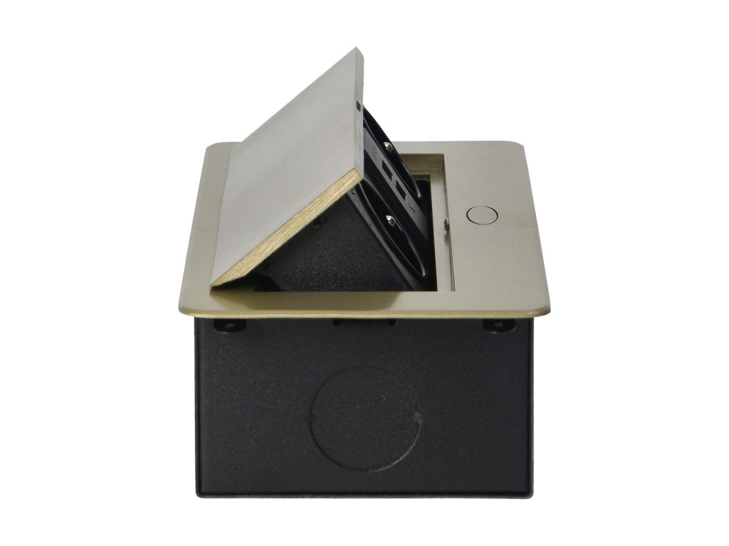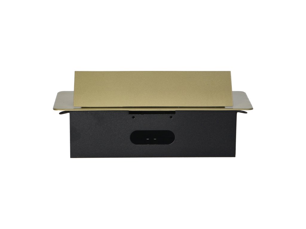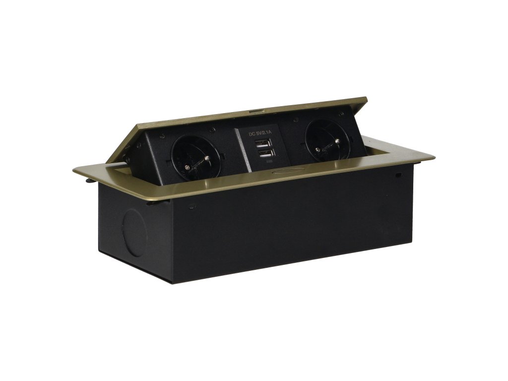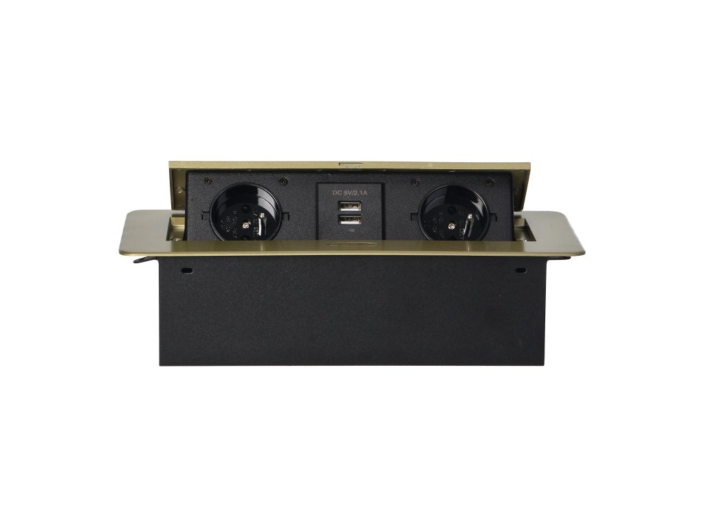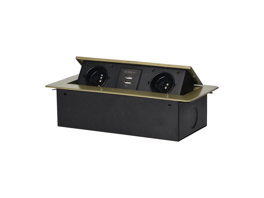 Súprava dvoch sieťových zásuviek s uzemnením a prúdovou ochranou v kombinácii s dvoma nabíjačkami USB. Súprava je zabudovaná do puzdra, ktoré možno integrovať do stolov, pracovných dosiek a stolov. Možno ju namontovať vertikálne aj horizontálne, čím sa zabezpečí pohodlný prístup k elektrickým zásuvkám. Vďaka plochej hrane (len 2 mm) kryt so zásuvkami dokonale zapadne do povrchu napr. stola a neprekáža pri jeho čistení. Odporúčaný kábel OWY 3 × 1,5 mm² (nie je súčasťou dodávky). Farba - mosadz.Všeobecné informácie: