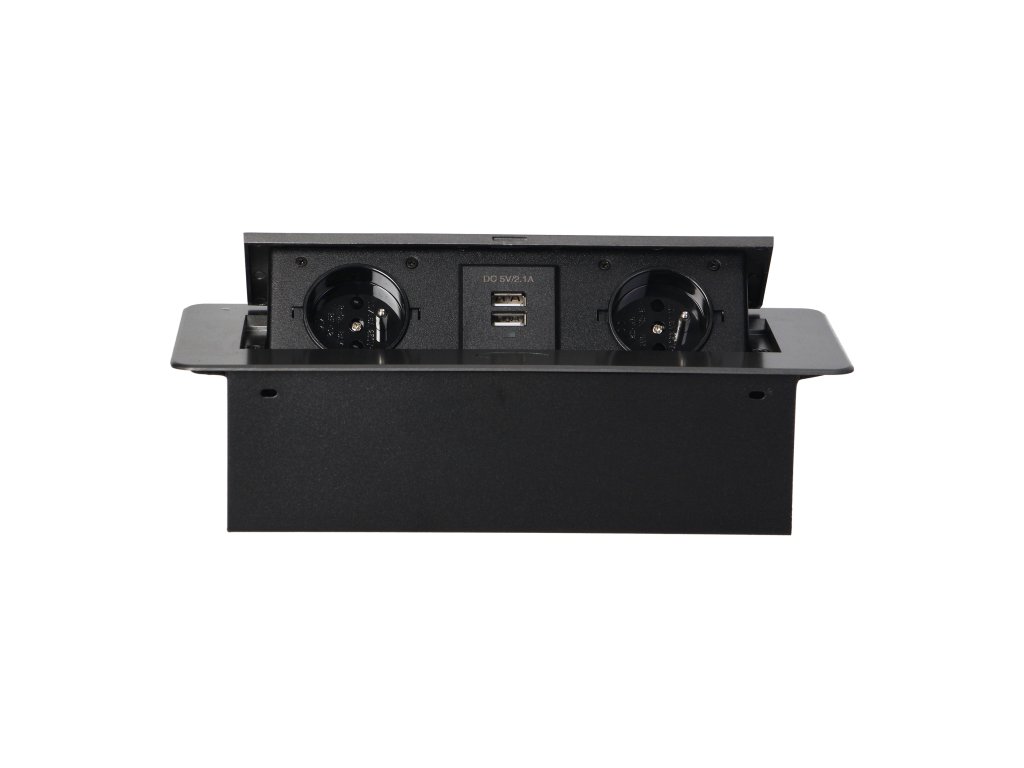 Súprava dvoch sieťových zásuviek s uzemnením a prúdovou ochranou v kombinácii s dvoma nabíjačkami USB. Súprava je zabudovaná do puzdra, ktoré možno integrovať do stolov, pracovných dosiek a stolov. Možno ju namontovať vertikálne aj horizontálne, čím sa zabezpečí pohodlný prístup k elektrickým zásuvkám. Vďaka plochej hrane (len 2 mm) kryt so zásuvkami dokonale zapadne do povrchu napr. stola a neprekáža pri jeho čistení. Odporúčaný kábel OWY 3 × 1,5 mm² (nie je súčasťou dodávky). Farba - grafitová.Technická špecifikácia