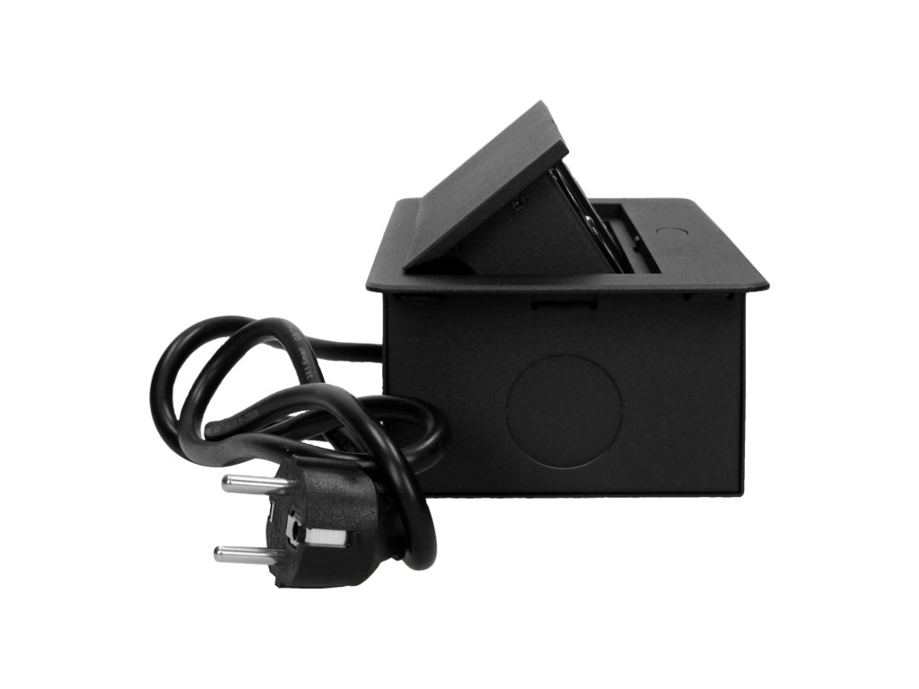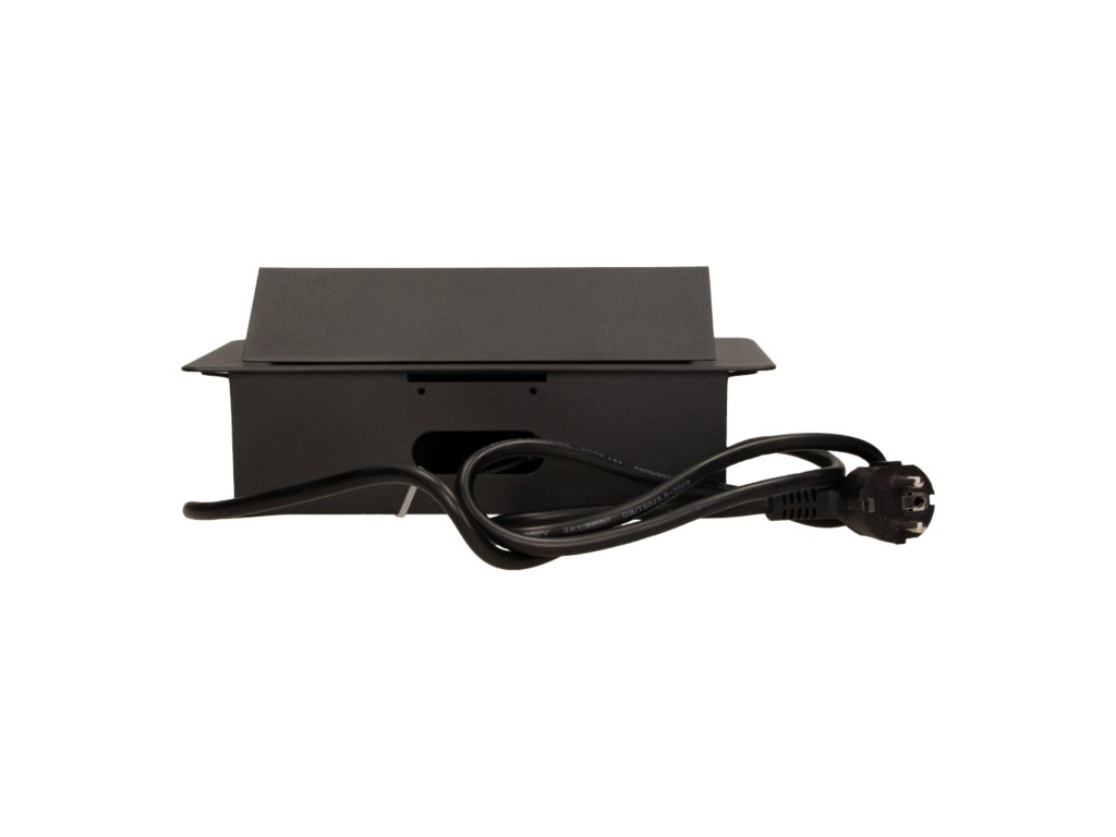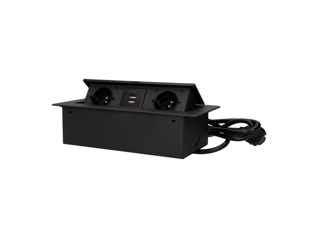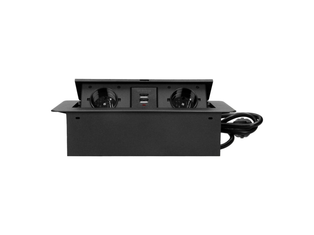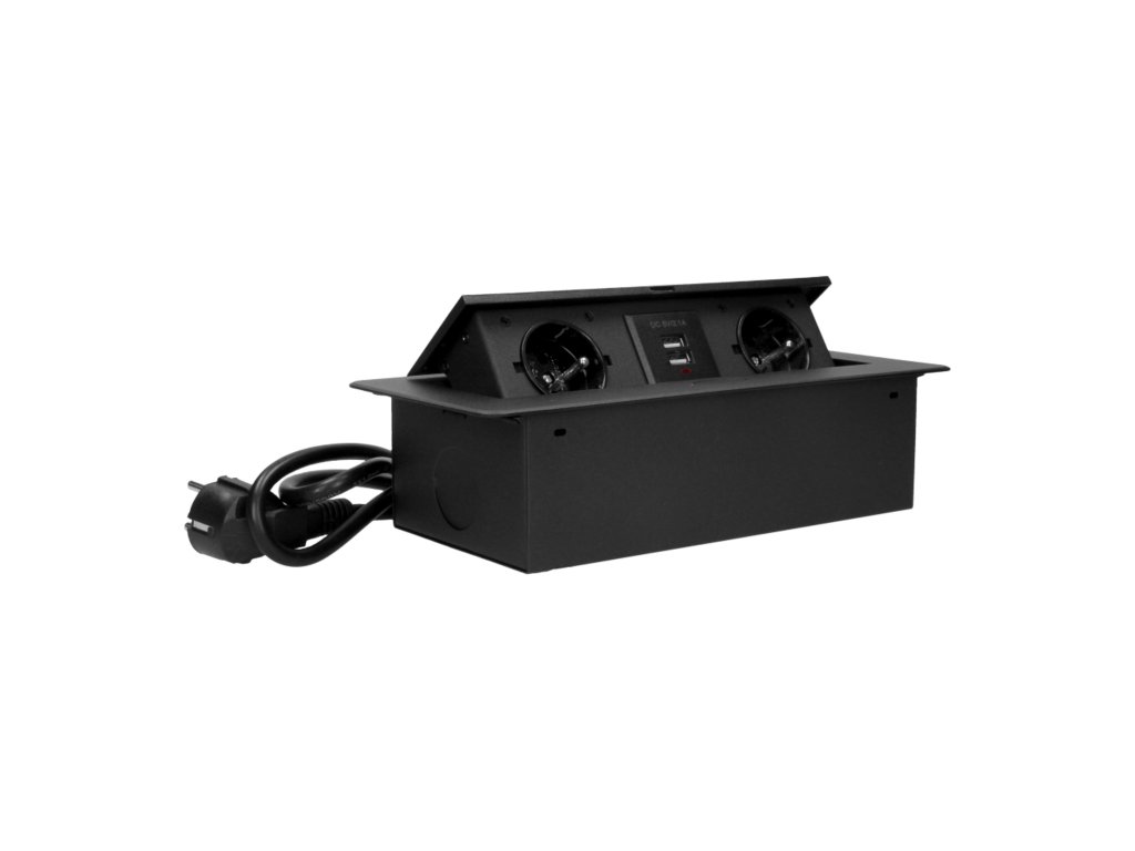 Súprava obsahuje dve zásuvky s uzemnením a bezpečnostnými uzávermi s maximálnym menovitým výkonom 2500 W a nabíjačku USB. Zásuvky sú umiestnené vo výsuvnom kryte. Zariadenie je určené na inštaláciu do stolov, pracovných dosiek a stolov. Vďaka veľmi plochému a frézovanému okraju vyzerá panel elegantne v každej stolovej doske a nesťažuje čistenie. Zásuvky možno namontovať vertikálne aj horizontálne, čo uľahčuje pripojenie ďalších zariadení k napájaniu. Panel zásuviek sa zatvára a otvára po stlačení. Súprava je vybavená 3 m dlhým káblom. Dostupné farby: čierna, strieborná.Všeobecné informácie