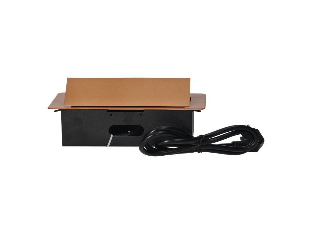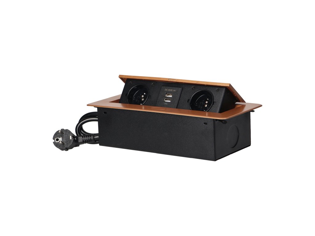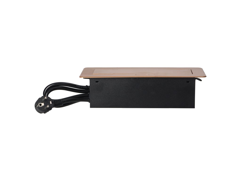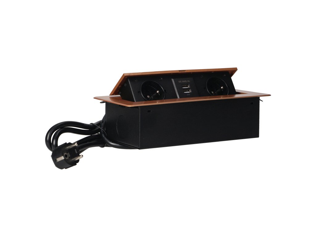 Súprava dvoch sieťových zásuviek s uzemnením a prúdovou ochranou v kombinácii s nabíjačkami USB zabudovanými do puzdra, ktoré možno integrovať do stolov, pracovných dosiek a stolov, sa dá namontovať vertikálne aj horizontálne a poskytuje pohodlný prístup k elektrickým zásuvkám. Vďaka plochej hrane (len 2 mm) kryt so zásuvkami dokonale zapadne do povrchu napr. stola a neprekáža pri jeho čistení. Súprava má predinštalovaný 1,5 m kábel. Farba - zlatá.Všeobecné informácie: