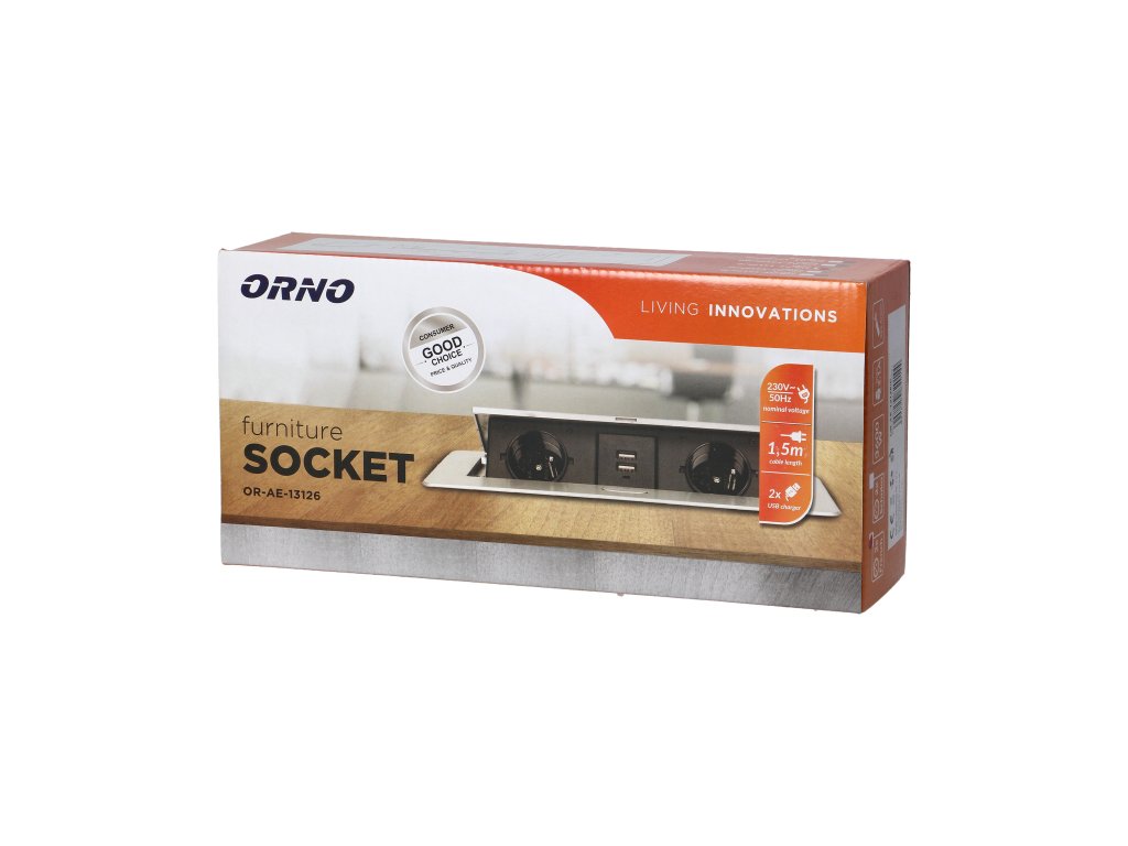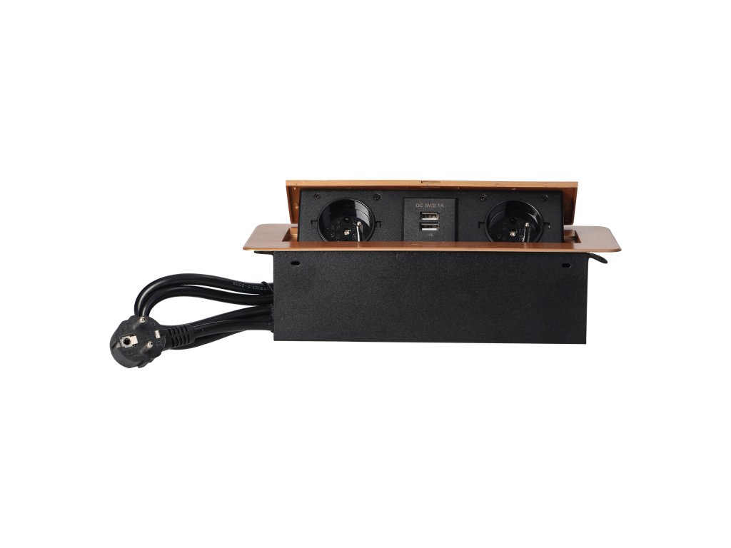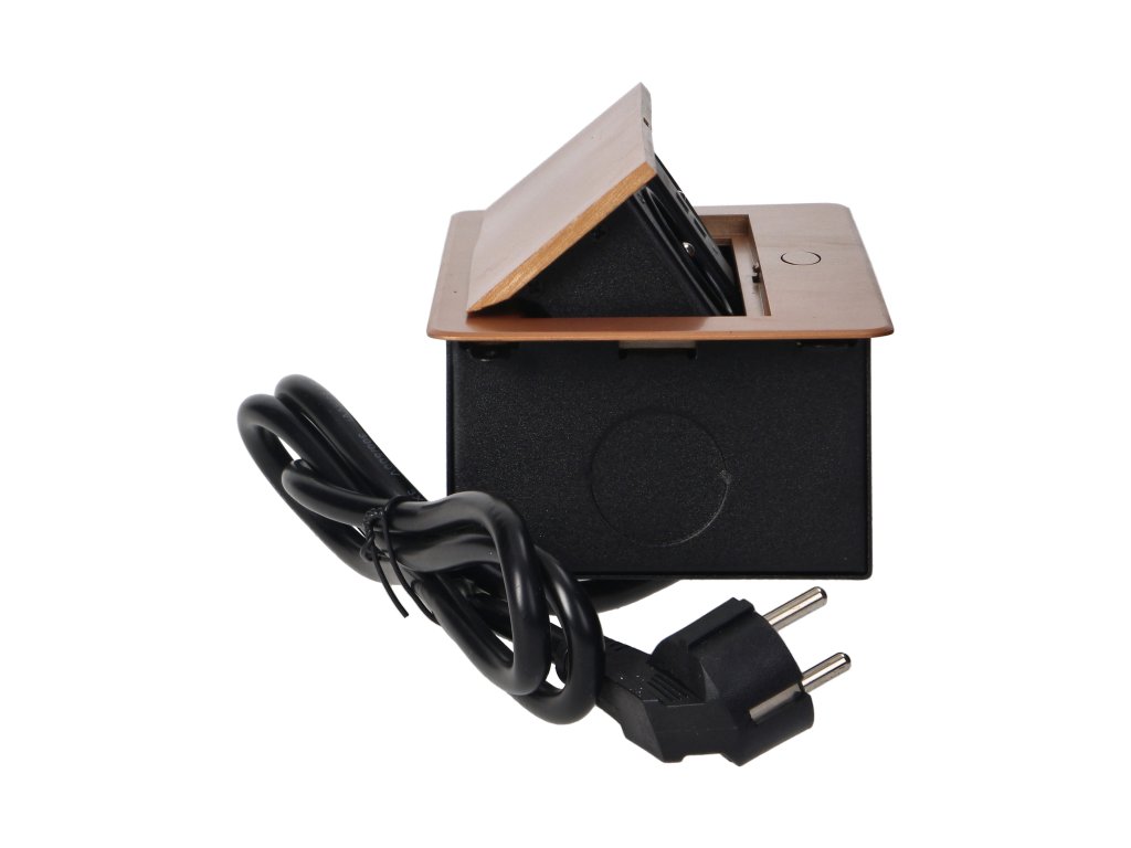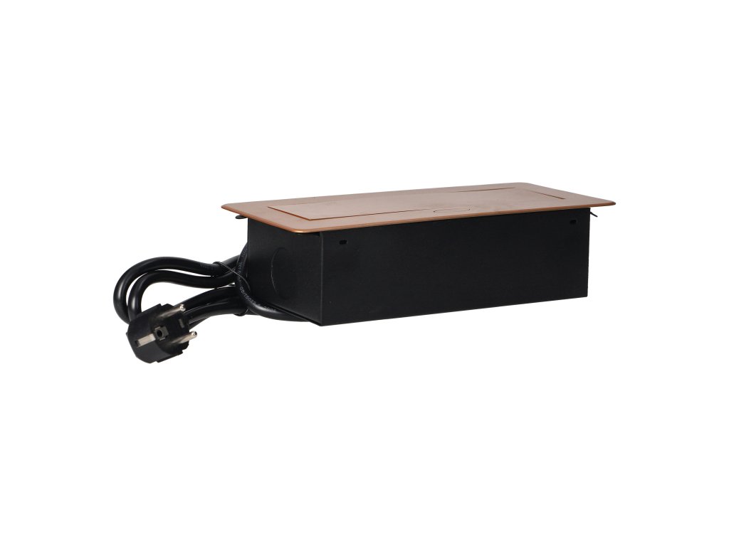 Súprava dvoch sieťových zásuviek s uzemnením a prúdovou ochranou v kombinácii s nabíjačkami USB zabudovanými do puzdra, ktoré možno integrovať do stolov, pracovných dosiek a stolov, sa dá namontovať vertikálne aj horizontálne a poskytuje pohodlný prístup k elektrickým zásuvkám. Vďaka plochej hrane (len 2 mm) kryt so zásuvkami dokonale zapadne do povrchu napr. stola a neprekáža pri jeho čistení. Súprava má predinštalovaný 1,5 m kábel. Farba - zlatá.Všeobecné informácie: