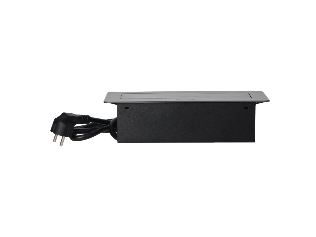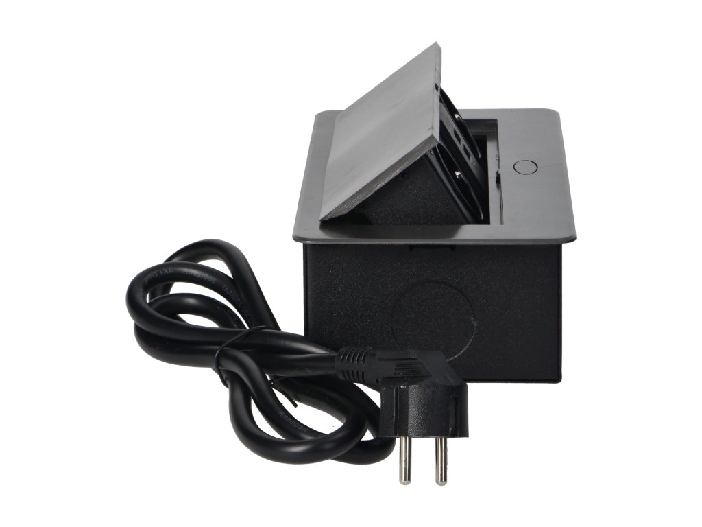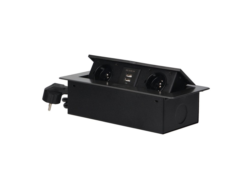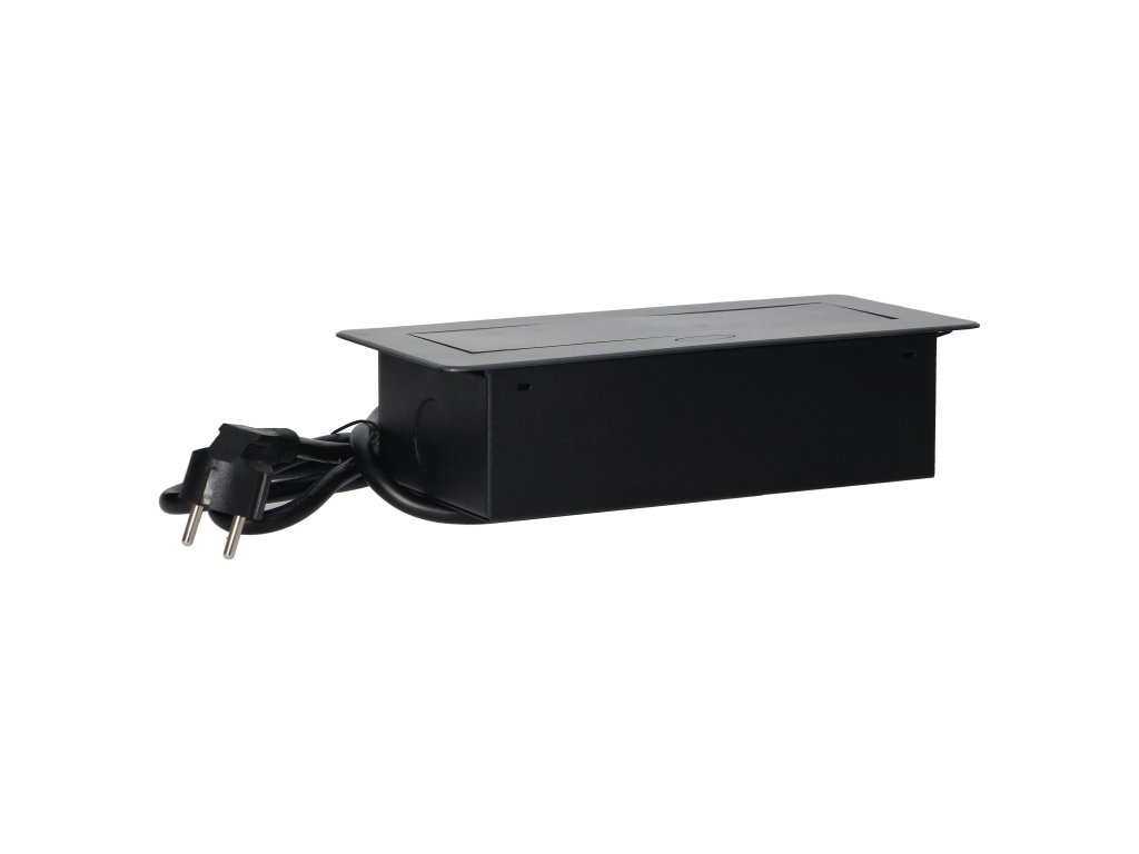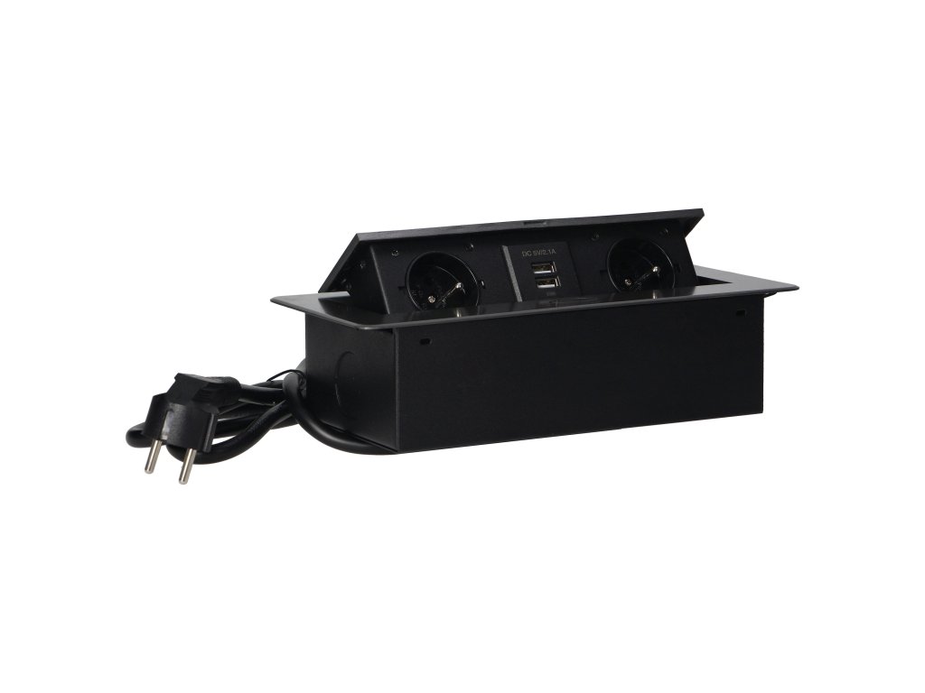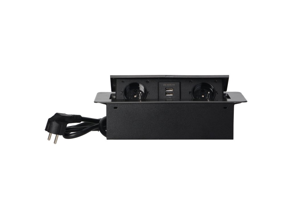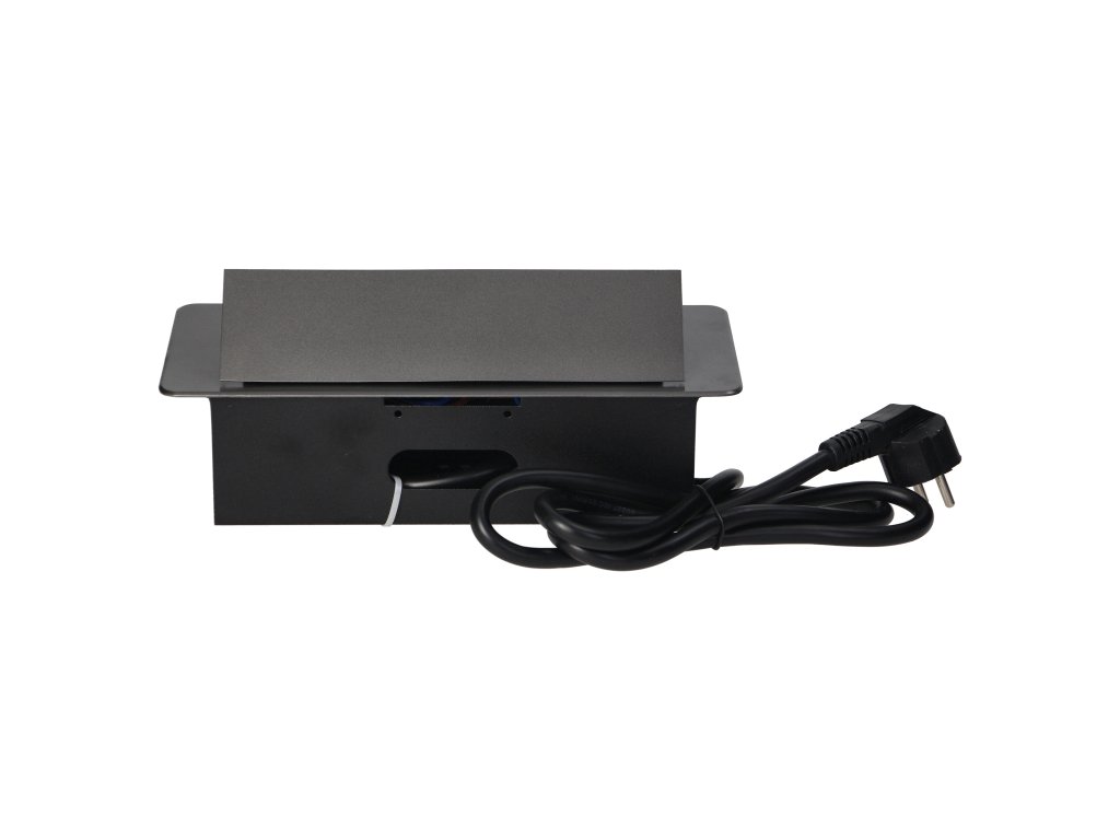 Súprava dvoch sieťových zásuviek s uzemnením a prúdovou ochranou v kombinácii s nabíjačkami USB zabudovanými do puzdra, ktoré možno integrovať do stolov, pracovných dosiek a stolov, sa dá namontovať vertikálne aj horizontálne a poskytuje pohodlný prístup k elektrickým zásuvkám. Vďaka plochej hrane (len 2 mm) kryt so zásuvkami dokonale zapadne do povrchu napr. stola a neprekáža pri jeho čistení. Súprava má predinštalovaný 1,5 m kábel. Farba - grafitová.Všeobecné informácie: