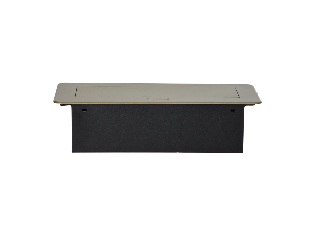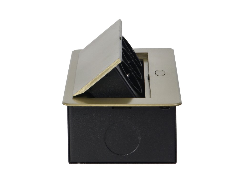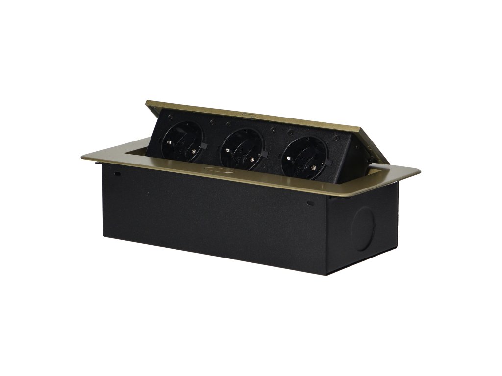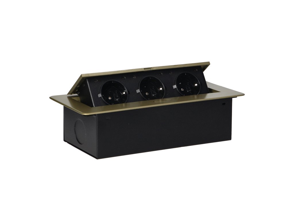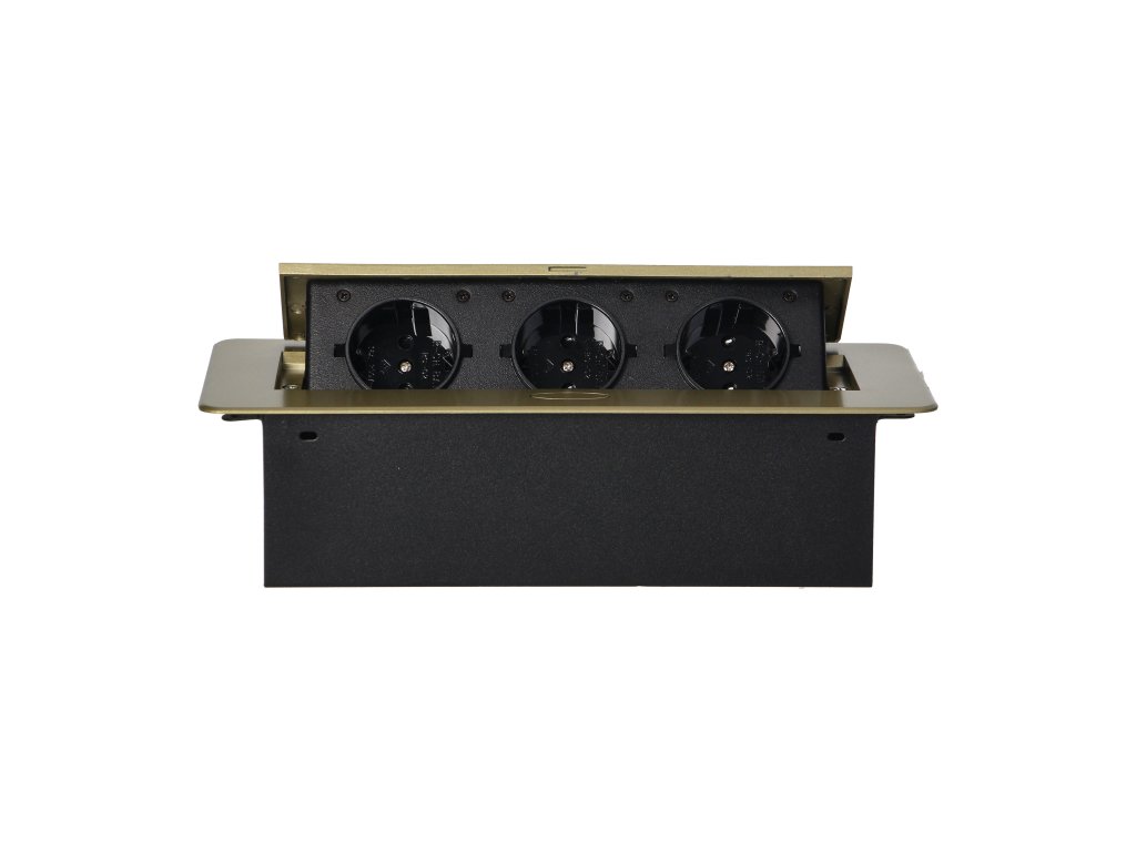 Súprava troch sieťových zásuviek s uzemnením Schuko a prúdovou ochranou v kryte ukrytom v hornej časti. Zariadenie je určené na inštaláciu do písacích stolov, pracovných dosiek a stolov, možno ho namontovať vertikálne aj horizontálne a poskytuje pohodlný prístup k elektrickým zásuvkám. Vďaka plochej hrane (len 2 mm) kryt so zásuvkami dokonale zapadne do povrchu napr. stola a neprekáža pri jeho čistení. Odporúčaný typ kábla - OWY 3 × 1,5 mm² (nie je súčasťou dodávky). Farba: mosadz.Všeobecné informácie: