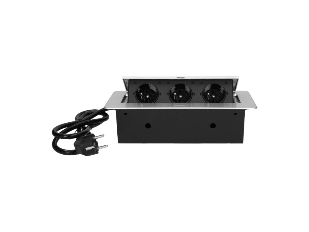 Súprava troch sieťových zásuviek s uzemnením a prúdovou ochranou s maximálnym menovitým výkonom 2500 W. Tieto zásuvky sú umiestnené vo výsuvnom kryte. Zariadenie je určené na inštaláciu do stolov, pracovných dosiek a stolov. Vďaka veľmi plochému a frézovanému okraju vyzerá panel v každej stolovej doske elegantne a nesťažuje čistenie. Zásuvky možno namontovať vertikálne aj horizontálne, čo uľahčuje pripojenie ďalších zariadení k napájaniu. Panel zásuviek sa zatvára a otvára po stlačení. Súprava je vybavená 3 m dlhým káblom. Dostupné farby: čierna, strieborná.Všeobecné informácie: