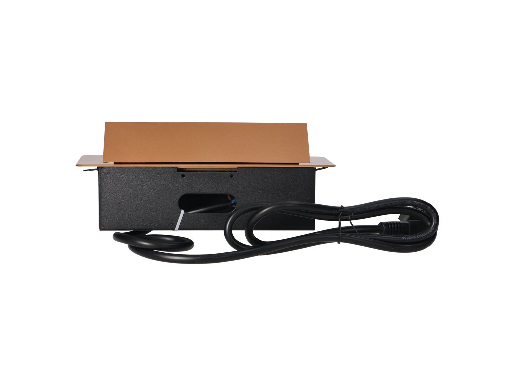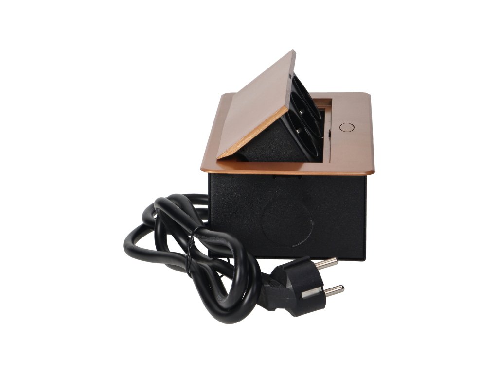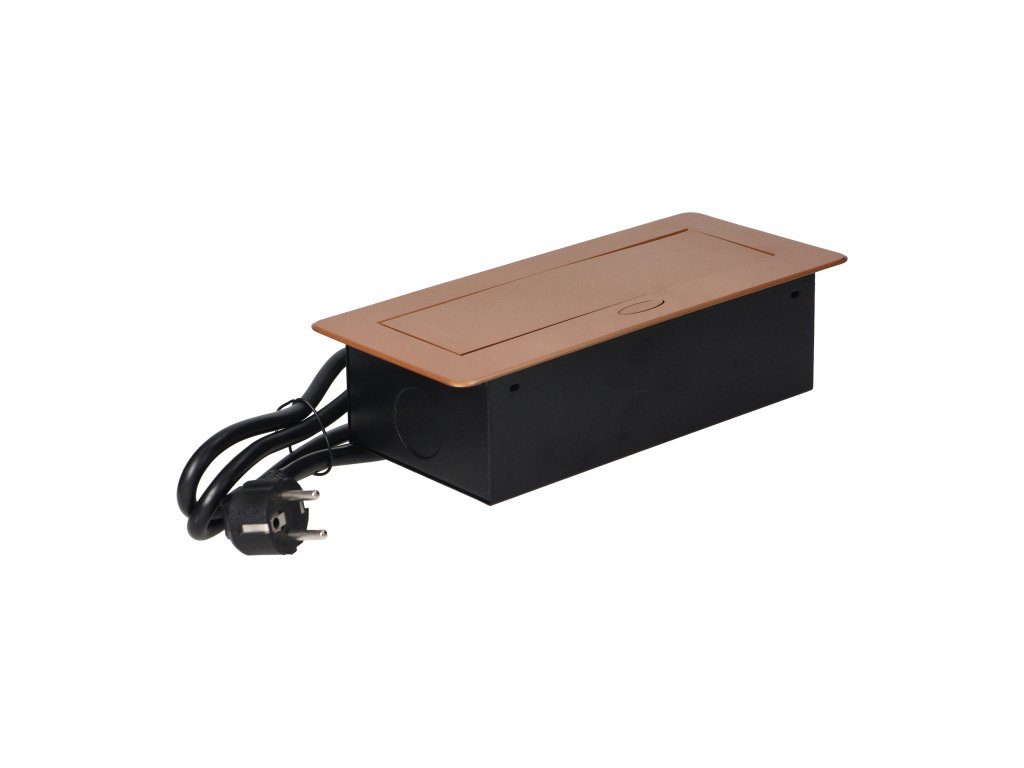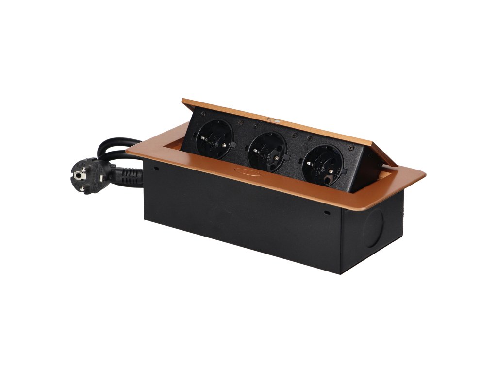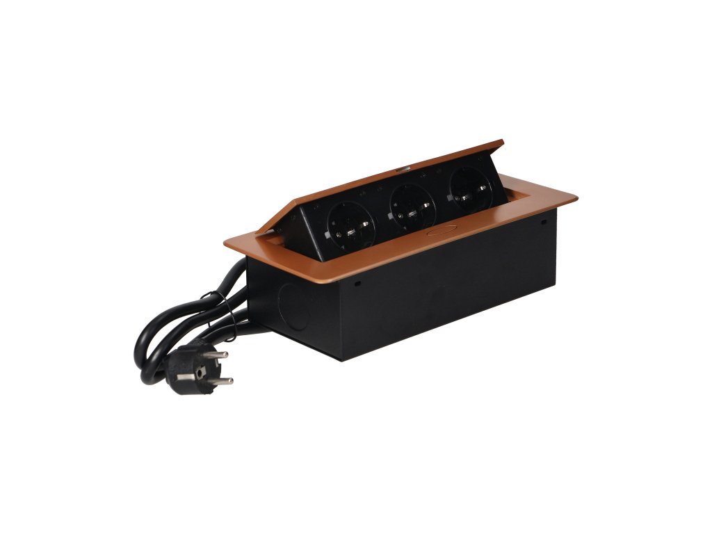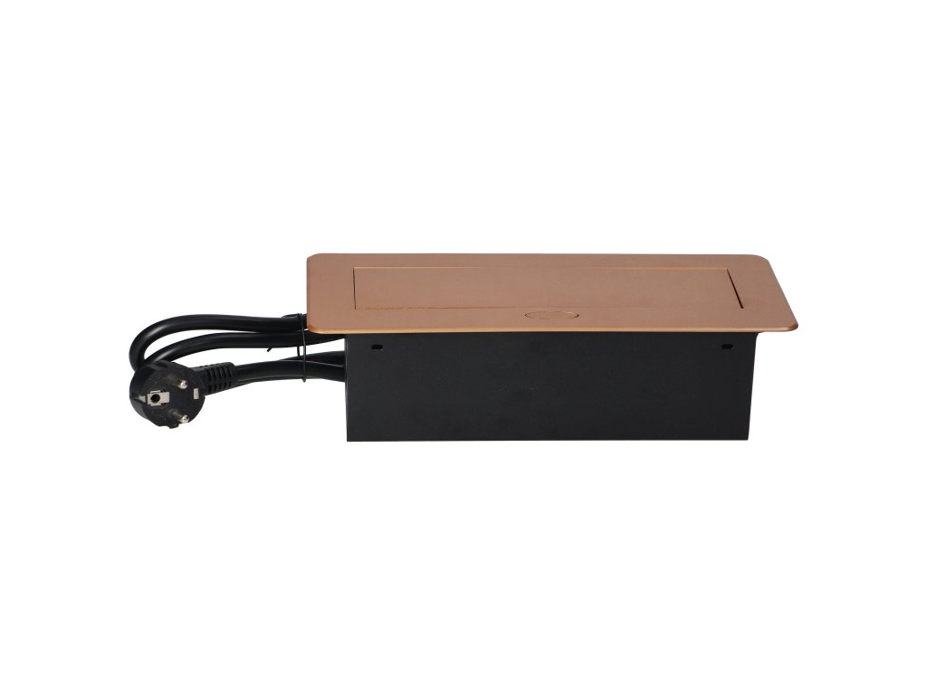 Súprava troch sieťových zásuviek s uzemnením Schuko a prúdovou ochranou v kryte ukrytom v hornej časti. Zariadenie je určené na inštaláciu do písacích stolov, pracovných dosiek a stolov, možno ho namontovať vertikálne aj horizontálne a poskytuje pohodlný prístup k elektrickým zásuvkám. Vďaka plochej hrane (len 2 mm) kryt so zásuvkami dokonale zapadne do povrchu napr. stola a neprekáža pri jeho čistení. Má uzavretý panel so sieťovými zásuvkami a 1,5 m dlhým káblom. Farba: zlatá.Technická špecifikácia