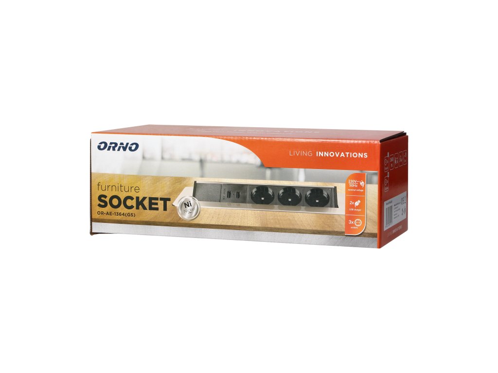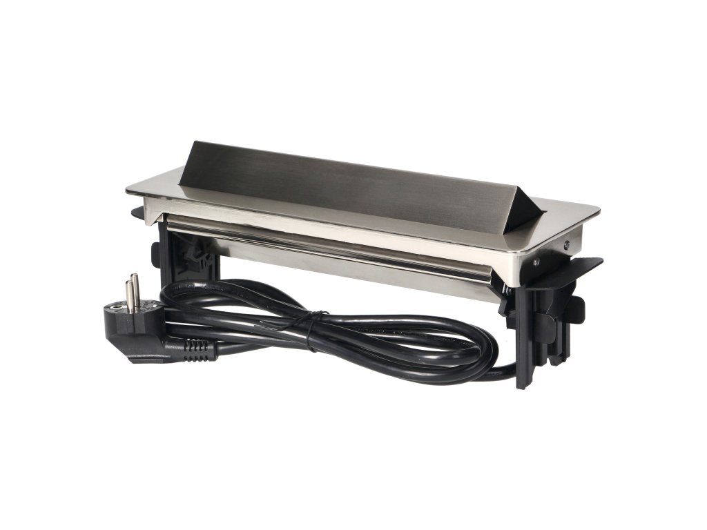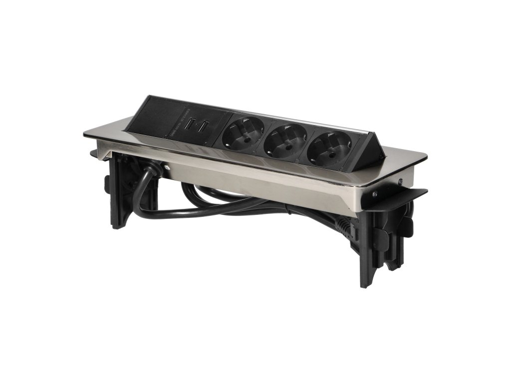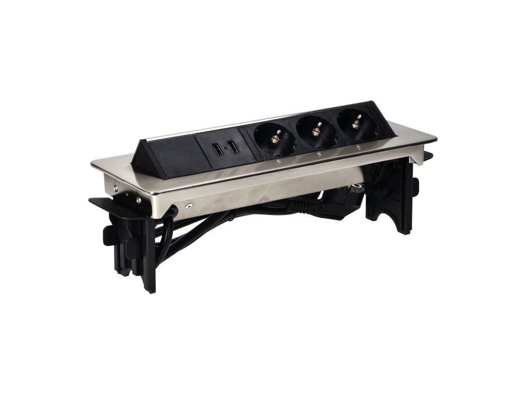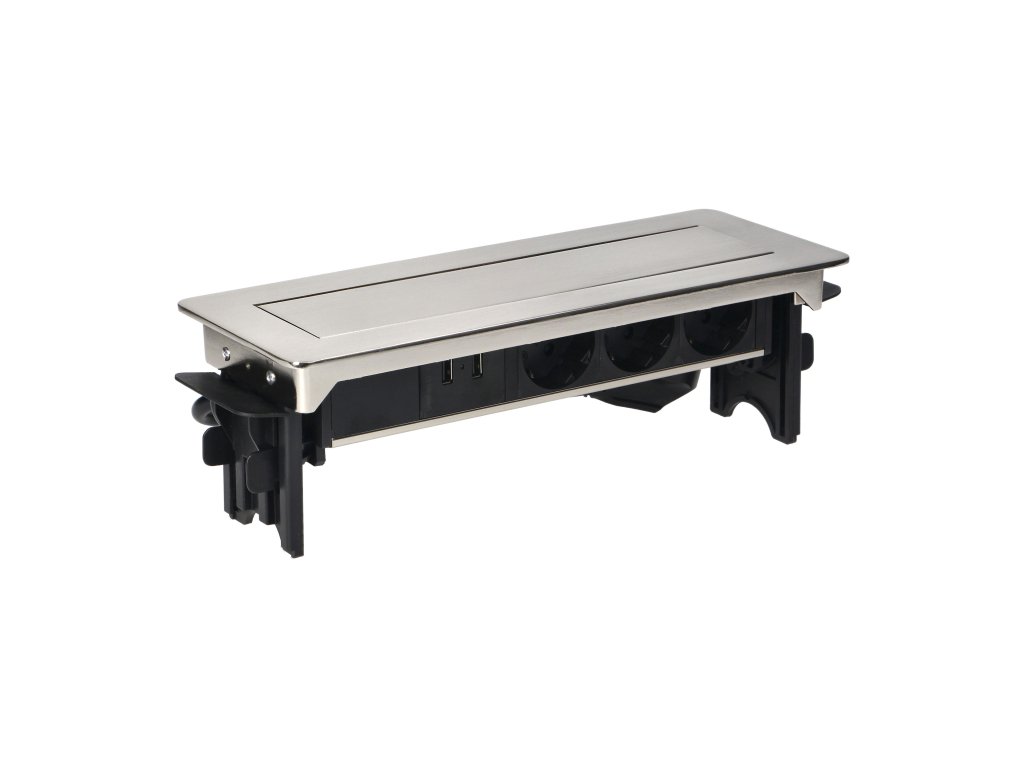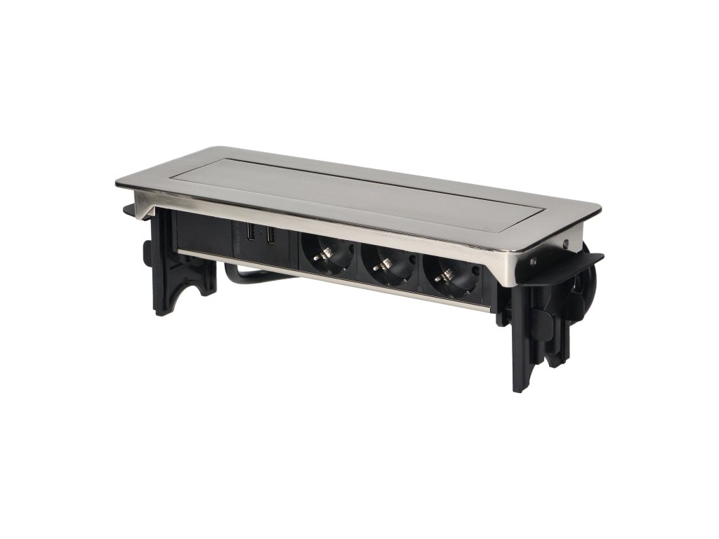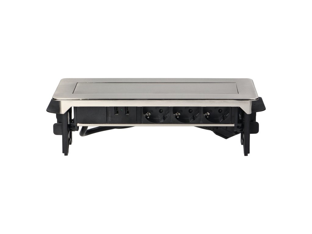 Sada tří síťových zásuvek se zemněním Schuko a proudovým chráničem připojená k USB nabíječce v elegantním poniklovaném pouzdře, které je skryté v desce stolu nebo stolu. Sada poskytuje pohodlný přístup k elektrickým zásuvkám vždy, když potřebujete připojit další zařízení. Díky kombinaci moderní konstrukce s vysoce kvalitní povrchovou úpravou je výrobek ideální pro použití v kanceláři, konferenční místnosti, pracovně, dílně, stejně jako v domácnosti. Má uzavřený panel se zásuvkami a 1,8 m dlouhým kabelem.Všeobecné informace
