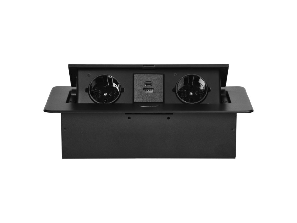 Táto výklopná zásuvka umožňuje súčasné pripojenie dvoch zariadení, vďaka dvom uzemneným zásuvkám typu Schuko (2x2P+E) a dvom USB portom (typ A a C).