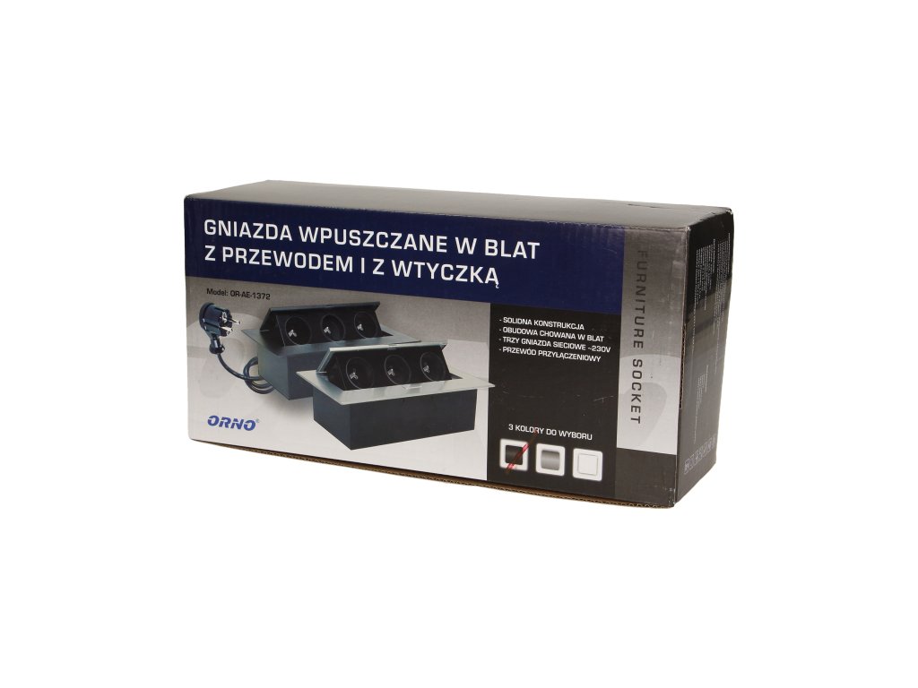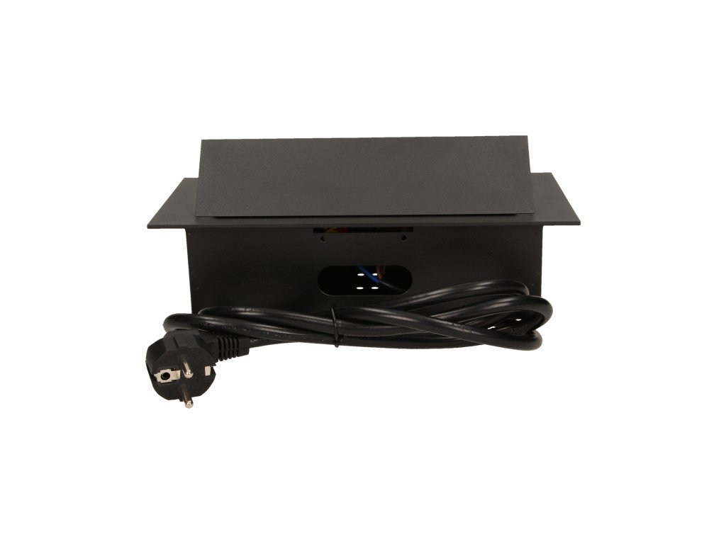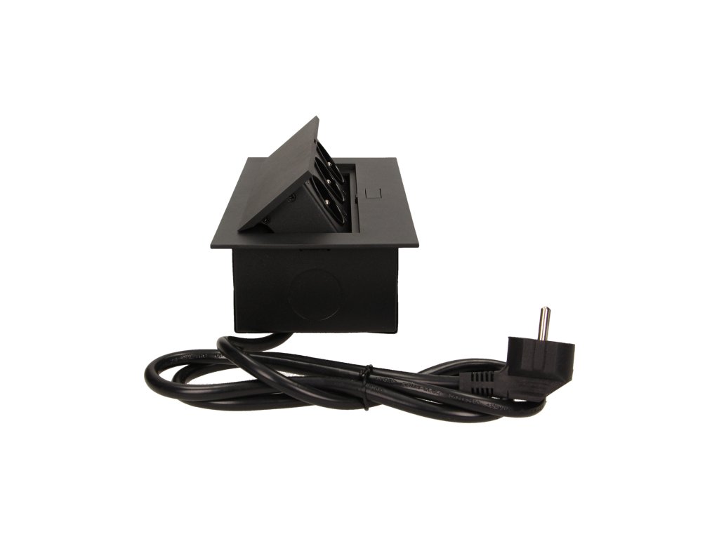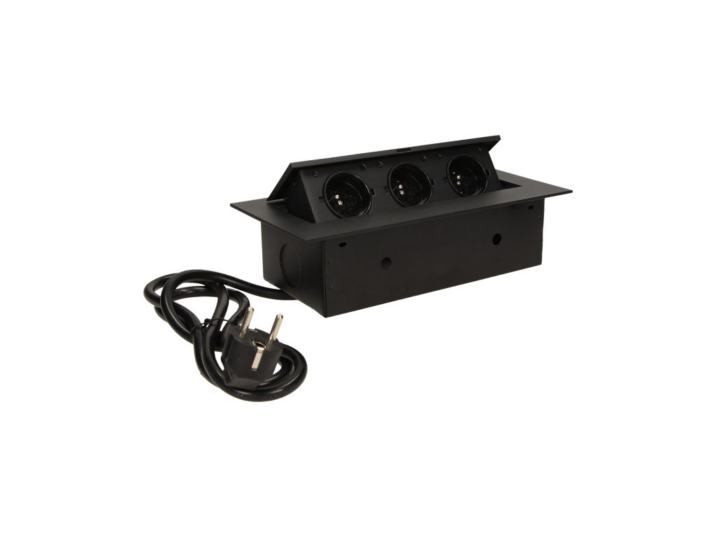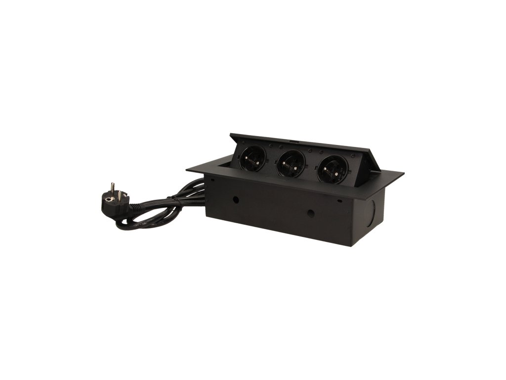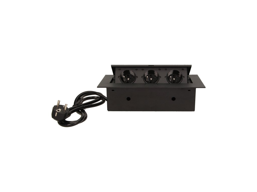 Sada tří elektrických zásuvek 2P+Z ve výsuvném horním krytu. Určeno pro vnitřní instalaci do stolů, stolových desek a stolků ve vertikální i horizontální poloze, přičemž poskytují přístup k elektrickým zásuvkám.Všeobecné informace: