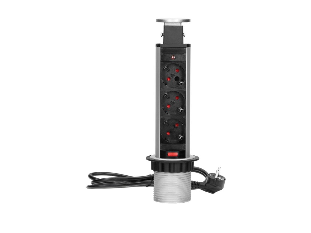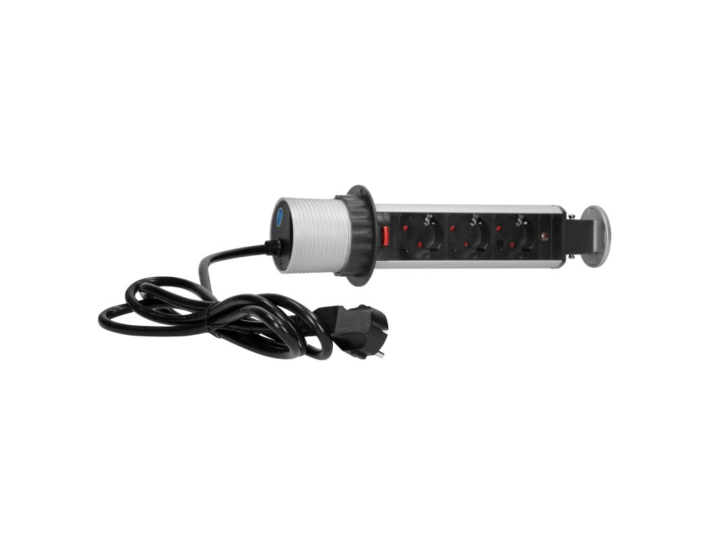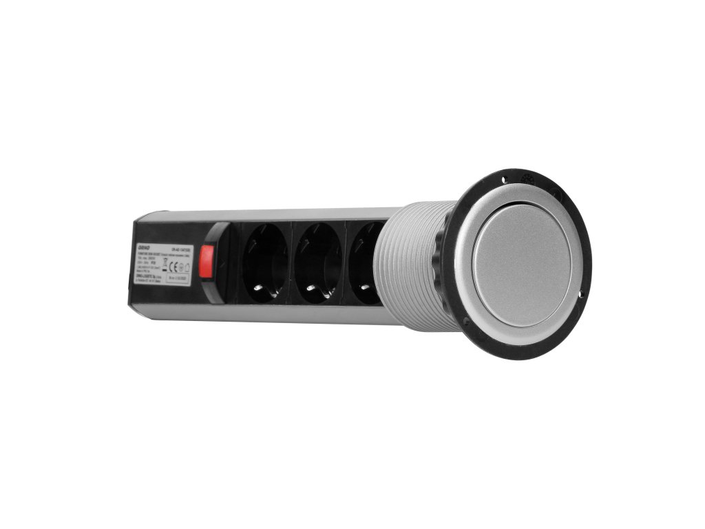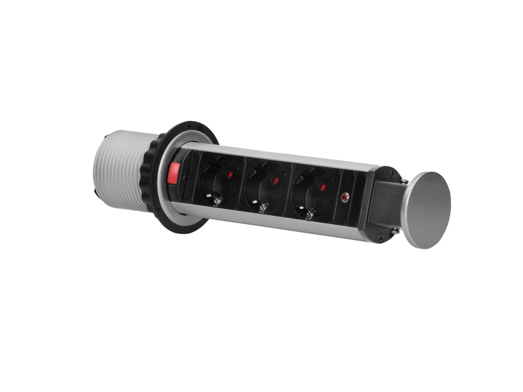 Sada troch zásuviek typu Schuko 2P+E s uzemnením a bezpečnostnými uzávermi, vo výsuvnom hornom kryte. Určené na vnútornú inštaláciu do stolov, stolových dosiek a kancelárskeho nábytku, ktoré poskytujú jednoduchý prístup k elektrickým zásuvkám. Má výsuvný panel so zásuvkami, prídavný blokovací systém a vodič dlhý 1,8 m. Inštalácia do stolovej dosky si vyžaduje iba jeden otvor Ø6 cm. Materiál - plast + lakovaný kov, strieborná farba.Všeobecné informácie: