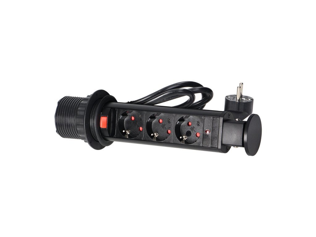 Sada troch zásuviek 2P+E s uzemnením Schuko a prúdovým chráničom, zabudovaná v zasúvacom puzdre. Súprava poskytuje prístup k ďalším elektrickým zásuvkám. Má vysúvací panel so zásuvkami, prídavný zámok a 1,8 m kábel. Určená na vnútornú inštaláciu do stolov, stolových dosiek a kancelárskeho nábytku. Na inštaláciu zariadenia do stolovej dosky stačí jeden otvor s priemerom 6 cm. Tento výrobok je vyrobený z plastu a čierno lakovaného kovu.Technická špecifikácia