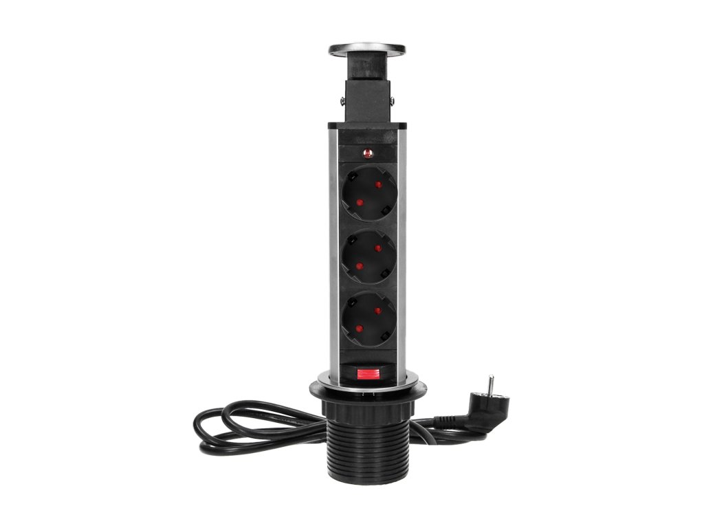 Sada troch zásuviek typu Schuko 2P+E s uzemnením a bezpečnostnými uzávermi, vo výsuvnom hornom kryte. Určené na vnútornú inštaláciu do stolov, stolových dosiek a kancelárskeho nábytku, ktoré poskytujú jednoduchý prístup k elektrickým zásuvkám. Má výsuvný panel so zásuvkami, prídavný blokovací systém a vodič dlhý 1,8 m. Inštalácia do stolovej dosky si vyžaduje iba jeden otvor Ø6 cm. Materiál - nehrdzavejúca oceľ INOX.Všeobecné informácie: