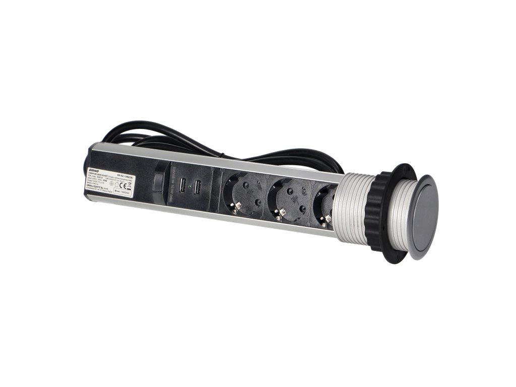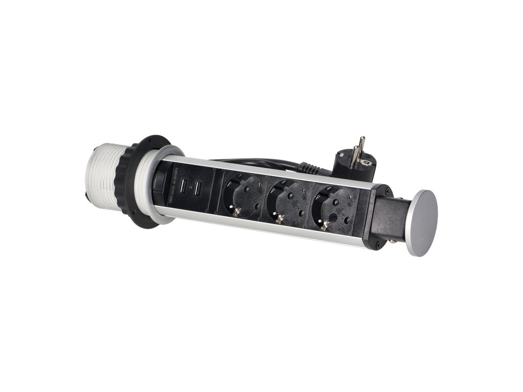 Sada troch zásuviek 2P+E s uzemnením Schuko a prúdovou ochranou v kombinácii s nabíjačkou USB. Všetko je zabudované do výsuvného krytu, ktorý poskytuje prístup k ďalším elektrickým zásuvkám. Má vysúvací panel so zásuvkami, prídavný zámok a 1,8 m kábel. Určené na vnútornú inštaláciu do stolov, stolových dosiek a kancelárskeho nábytku. Na inštaláciu zariadenia do stolovej dosky stačí jeden otvor s priemerom 6 cm. Tento výrobok je vyrobený z plastu a strieborne lakovaného kovu.Technická špecifikácia
