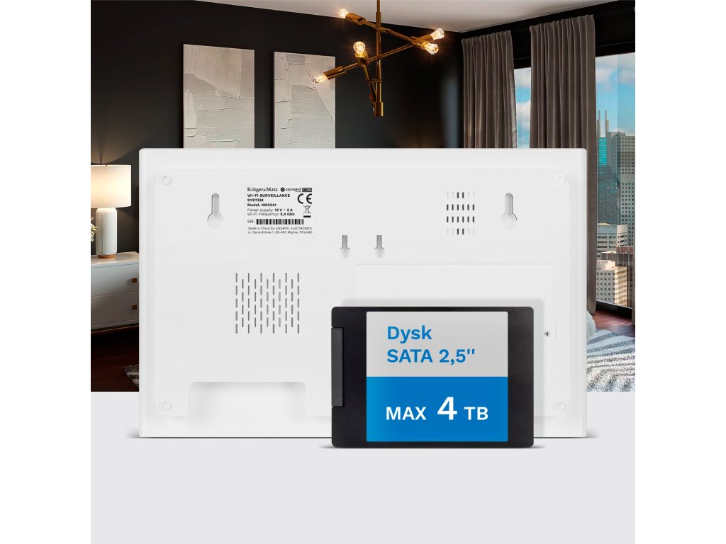 Priloženi rekorder podržava diskove s maksimalnim kapacitetom od 4 TB. Ovaj kapacitet dovoljan je za mjesec kvalitetnih Full HD snimaka. Zahvaljujući nadzornom sustavu Kruger&Matz Connect C210, nijedan detalj neće vam promaknuti.