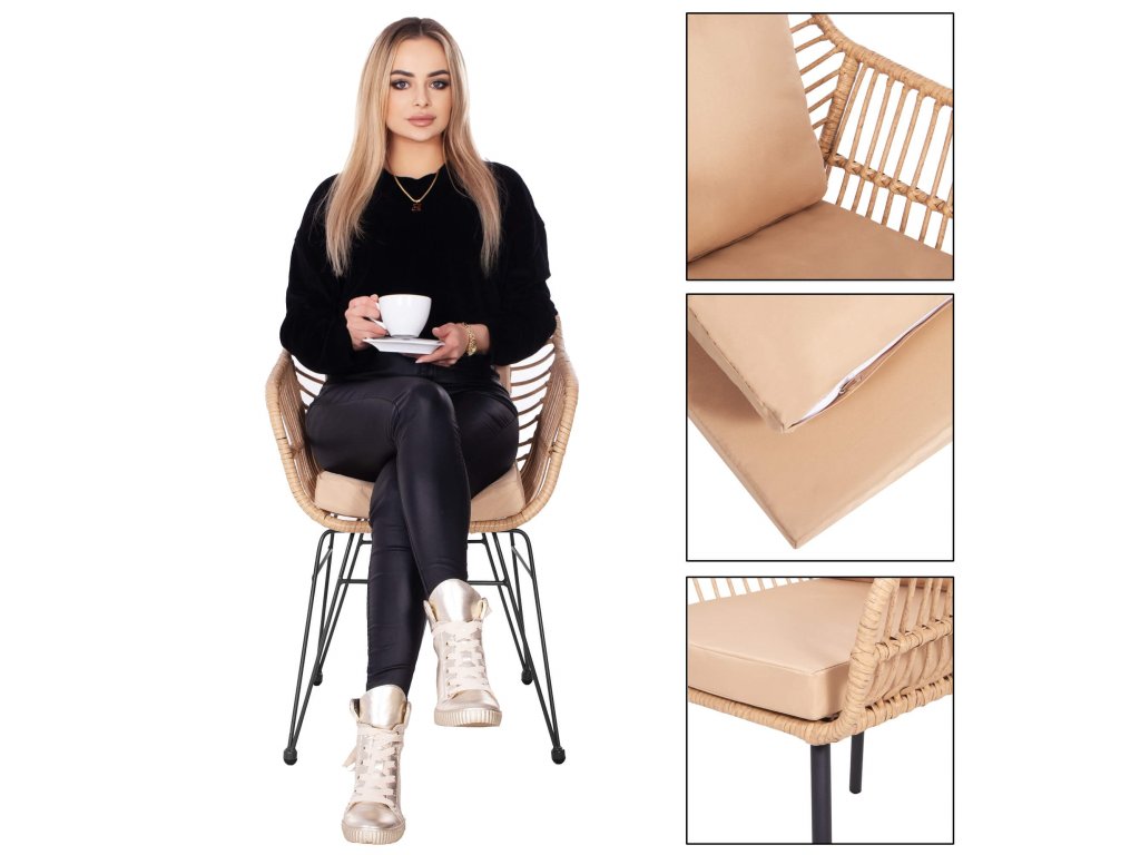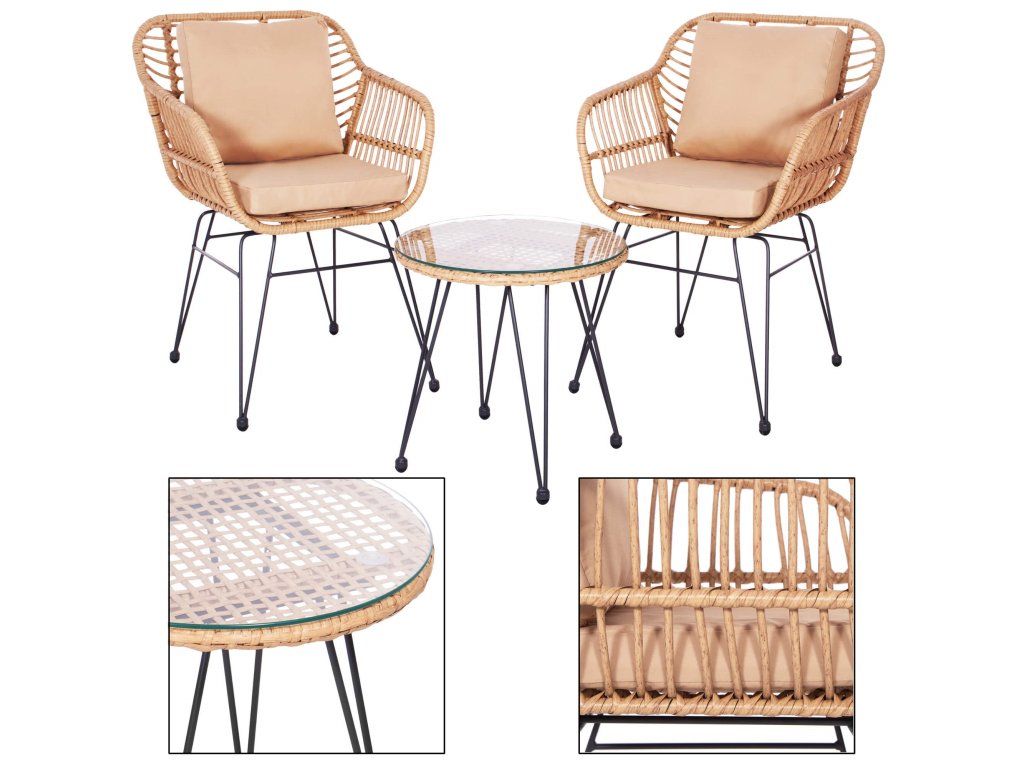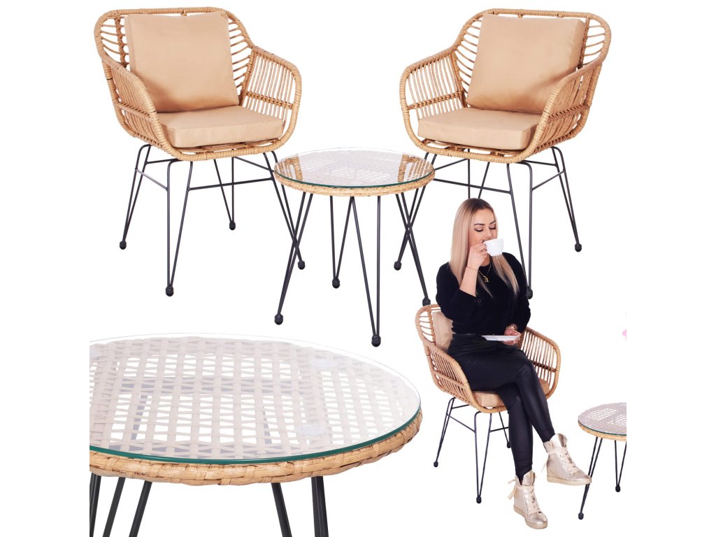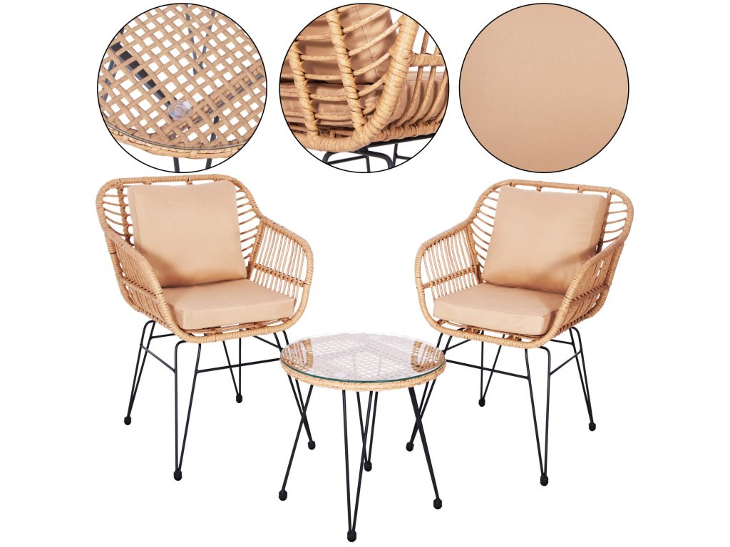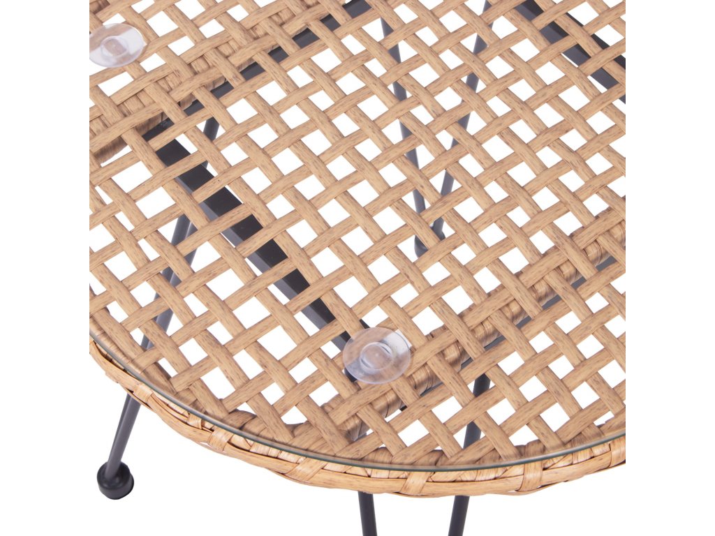 - Materiál: technorattan, tvrdené sklo, kov, polyester/PP pena