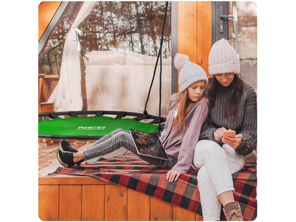 Izvrsna zabava za mlađe i malo starije. Ljuljačka na čeličnom okviru prekrivena mekom zaštitnom pjenom, izrađena od čvrstog materijala s višestrukim šavovima i debelim visećim užadima. Osigurava sigurnost, stabilnost i izdržljivost. Poliester Oxford 600D, od kojeg je sjedalo izrađeno, je vodootporan i lako se čisti.