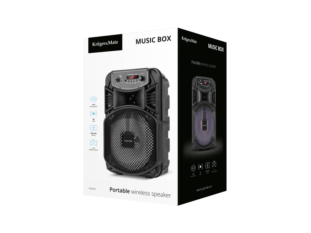 Pozvali ste svoje prijatelje na kućnu zabavu Pobrinite se da ovaj večer ostane u njihovom sjećanju dugo vremena i odaberite Kruger&Matz Music Box! Jedna od glavnih prednosti ovog Bluetooth zvučnika je ulaz za mikrofon, što vam omogućuje pretvoriti uređaj u karaoke set. Atmosferu zabave upotpunjuje i izraženo pozadinsko osvjetljenje. Želite plesati s prijateljima Music Box je opremljen s dva zvučnika - 8-inčnim i 1-inčnim - koji će svirati snagom od 10 W. Ako vam to nije dovoljno, možete iskoristiti funkciju True Wireless Stereo, koja omogućava bežično povezivanje dva Kruger&Matz Music Box zvučnika.