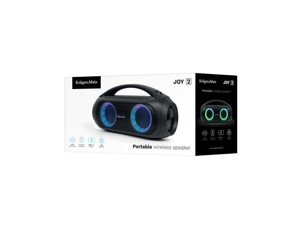 Zvučnik Kruger&Matz Joy 2 Bluetooth opremljen je s dva srednjetonska zvučnika i visokotoncem promjera 1,5 inča s ukupnom snagom od 20 W. Osim toga, ovaj model opremljen je s dvije pasivne membrane za pojačanje basa.